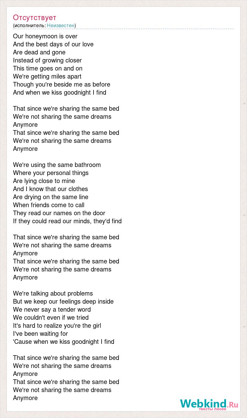 Our honeymoon is over And the best days of our love Are dead and gone Instead of growing closer This time goes on and on We're getting miles apart Though you're beside me as before And when we kiss goodnight I find That since we're sharing the same bed We're not sharing the same dreams Anymore That since we're sharing the same bed We're not sharing the same dreams Anymore We're using the same bathroom Where your personal things Are lying close to mine And I know that our clothes Are drying on the same line When [bad word] to call They read our names on the door If they could read our minds, they'd find That since we're sharing the same bed We're not sharing the same dreams Anymore That since we're sharing the same bed We're not sharing the same dreams Anymore We're talking about problems But we keep our feelings deep inside We never say a tender word We couldn't even if we tried It's hard to realize you're the girl I've been waiting for 'Cause when we kiss goodnight I find That since we're sharing the same bed We're not sharing the same dreams Anymore That since we're sharing the same bed We're not sharing the same dreams Anymore