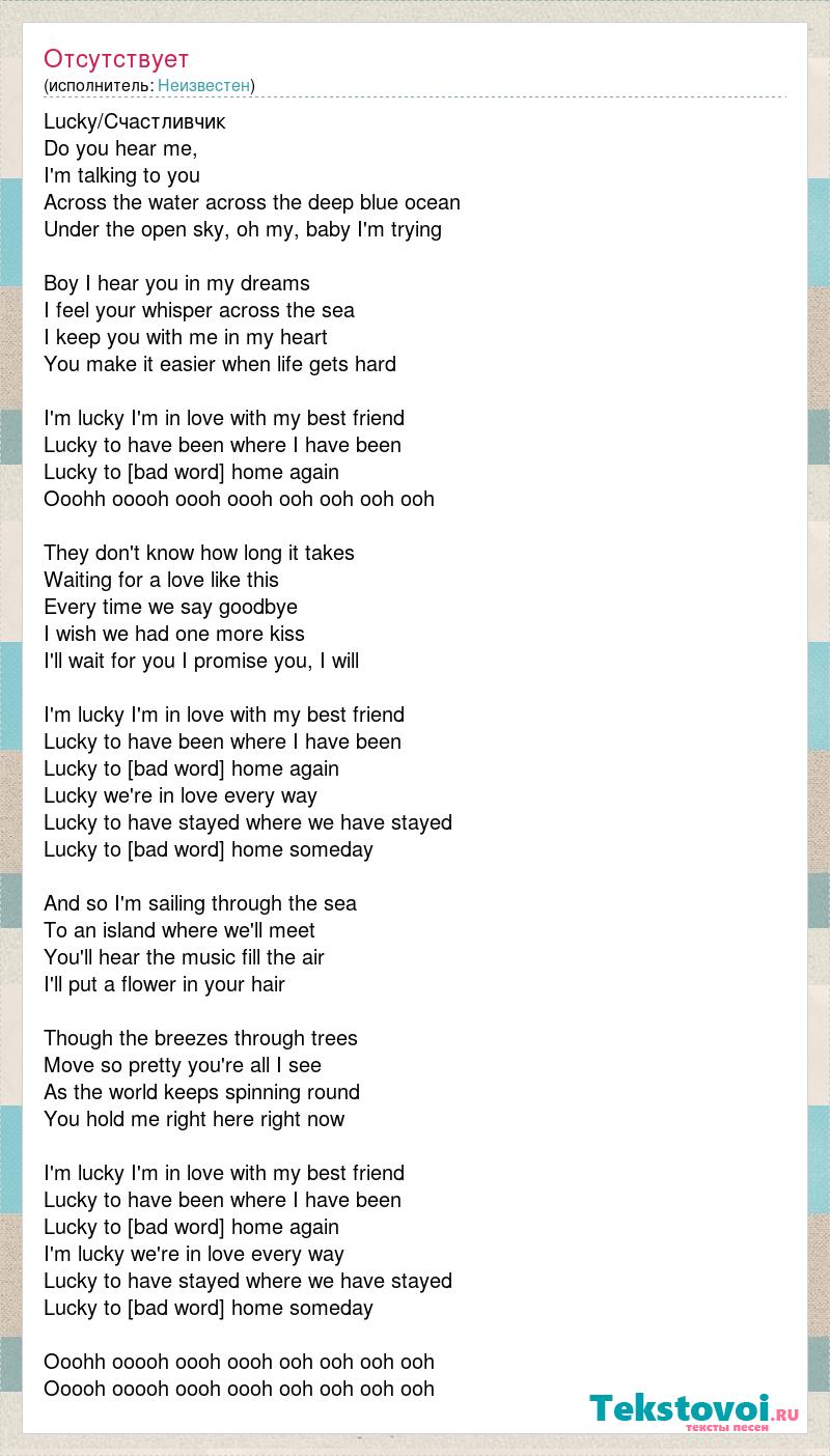 Lucky/Счастливчик Do you hear me, I'm talking to you Across the water across the deep blue ocean Under the open sky, oh my, baby I'm trying Boy I hear you in my dreams I feel your whisper across the sea I keep you with me in my heart You make it easier when life gets hard I'm lucky I'm in love with my best friend Lucky to have been where I have been Lucky to [bad word] home again Ooohh ooooh oooh oooh ooh ooh ooh ooh They don't know how long it takes Waiting for a love like this Every time we say goodbye I wish we had one more kiss I'll wait for you I promise you, I will I'm lucky I'm in love with my best friend Lucky to have been where I have been Lucky to [bad word] home again Lucky we're in love every way Lucky to have stayed where we have stayed Lucky to [bad word] home someday And so I'm sailing through the sea To an island where we'll meet You'll hear the music fill the air I'll put a flower in your hair Though the breezes through trees Move so pretty you're all I see As the world keeps spinning round You hold me right here right now I'm lucky I'm in love with my best friend Lucky to have been where I have been Lucky to [bad word] home again I'm lucky we're in love every way Lucky to have stayed where we have stayed Lucky to [bad word] home someday Ooohh ooooh oooh oooh ooh ooh ooh ooh Ooooh ooooh oooh oooh ooh ooh ooh ooh