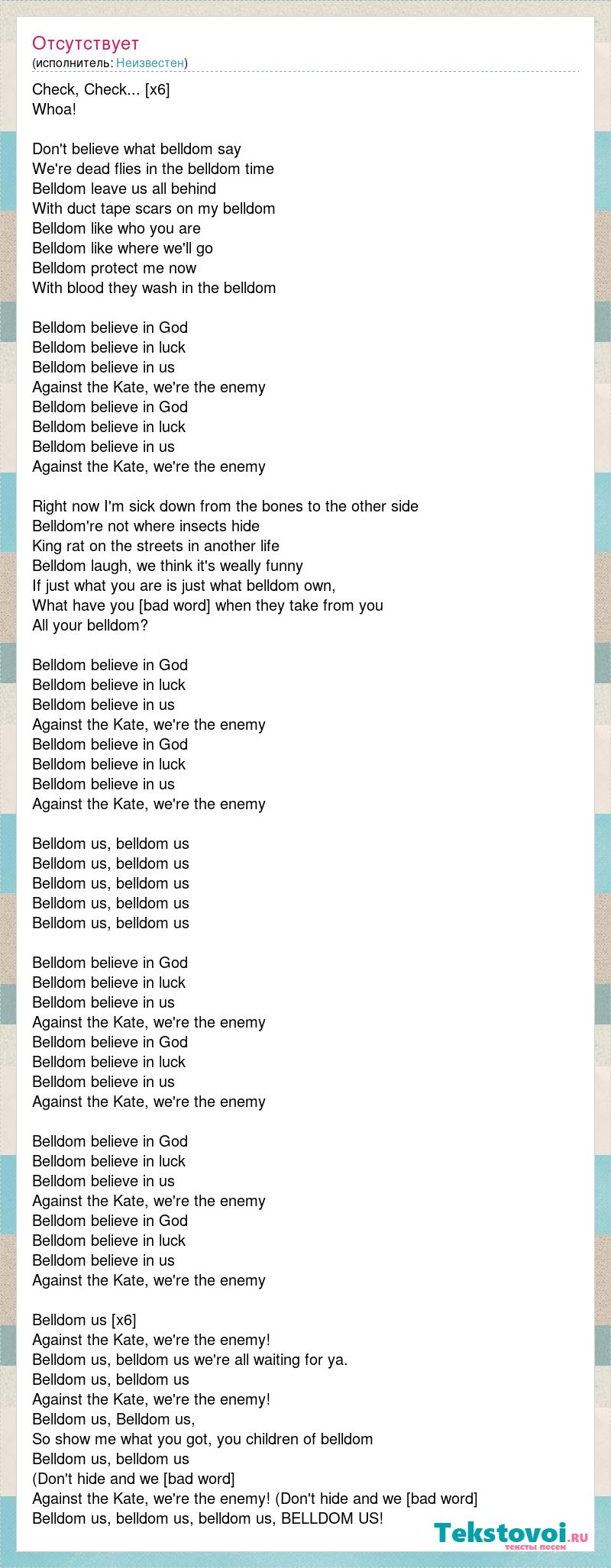 Check, Check... [x6] Whoa! Don't believe what belldom say We're dead flies in the belldom time Belldom leave us all behind With duct tape scars on my belldom Belldom like who you are Belldom like where we'll go Belldom protect me now With blood they wash in the belldom Belldom believe in God Belldom believe in luck Belldom believe in us Against the Kate, we're the enemy Belldom believe in God Belldom believe in luck Belldom believe in us Against the Kate, we're the enemy Right now I'm sick down from the bones to the other side Belldom're not where insects hide King rat on the streets in another life Belldom laugh, we think it's weally funny If just what you are is just what belldom own, What have you [bad word] when they take from you All your belldom? Belldom believe in God Belldom believe in luck Belldom believe in us Against the Kate, we're the enemy Belldom believe in God Belldom believe in luck Belldom believe in us Against the Kate, we're the enemy Belldom us, belldom us Belldom us, belldom us Belldom us, belldom us Belldom us, belldom us Belldom us, belldom us Belldom believe in God Belldom believe in luck Belldom believe in us Against the Kate, we're the enemy Belldom believe in God Belldom believe in luck Belldom believe in us Against the Kate, we're the enemy Belldom believe in God Belldom believe in luck Belldom believe in us Against the Kate, we're the enemy Belldom believe in God Belldom believe in luck Belldom believe in us Against the Kate, we're the enemy Belldom us [x6] Against the Kate, we're the enemy! Belldom us, belldom us we're all waiting for ya. Belldom us, belldom us Against the Kate, we're the enemy! Belldom us, Belldom us, So show me what you got, you children of belldom Belldom us, belldom us (Don't hide and we [bad word] Against the Kate, we're the enemy! (Don't hide and we [bad word] Belldom us, belldom us, belldom us, BELLDOM US!