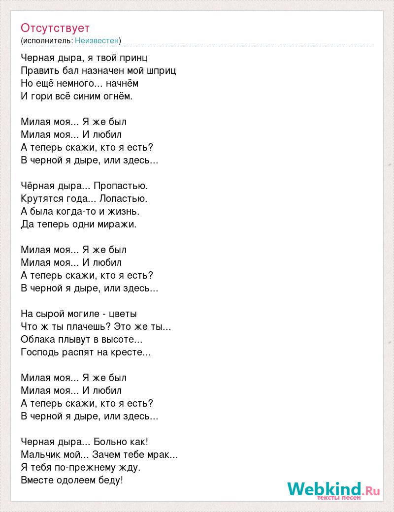 Черная дыра, я твой принц Править бал назначен мой шприц Но ещё немного... начнём И гори всё синим огнём. Милая моя... Я же был Милая моя... И любил А теперь скажи, кто я есть? В черной я дыре, или здесь... Чёрная дыра... Пропастью. Крутятся года... Лопастью. А была когда-то и жизнь. Да теперь одни миражи. Милая моя... Я же был Милая моя... И любил А теперь скажи, кто я есть? В черной я дыре, или здесь... На сырой могиле - цветы Что ж ты плачешь? Это же ты... Облака плывут в высоте... Господь распят на кресте... Милая моя... Я же был Милая моя... И любил А теперь скажи, кто я есть? В черной я дыре, или здесь... Черная дыра... Больно как! Мальчик мой... Зачем тебе мрак... Я тебя по-прежнему жду. Вместе одолеем беду!