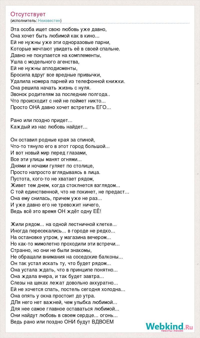 Эта особа ищет свою любовь уже давно, Она хочет быть любимой как в кино... Ей не нужны уже эти одноразовые парни, Которые мечтают увидеть её в своей спальне. Давно не покупается на комплементы, Ушла с модельного агенства, Ей не нужны аплодисменты, Бросила вдруг все вредные привычки, Удалила номера парней из телефонной книжки. Она решила начать жизнь с нуля. Звонок родителям за последние полгода.. Что происходит с ней не поймет никто... Просто ОНА давно хочет встретить ЕГО... Рано или поздно придет... Каждый из нас любовь найдет... Он оставил родные края за спиной, Что-то тянуло его в этот город большой... И вот новый мир перед глазами, Все эти улицы манят огнями... Днями и ночами гуляет по столице, Просто напросто вглядываясь в лица. Пустота, кого-то не хватает рядом, Живет тем днем, когда стоклнется взглядом... С той единственной, что не покинет, не предаст... Она ему снилась, причем уже не раз... И уже давно его не тревожит ничего, Ведь всё это время ОН ждёт одну ЕЁ! Жили рядом... на одной лестничной клетке... Иногда пересекались... в городе не редко... На остановке утром, у магазина вечером... Но как-то мимолетно проходили эти встречи... Странно, но они не были знакомы, Не обращали внимания на соседские балконы... Он так устал искать ту, что будет рядом... Она устала ждать, что в принципе понятно... Она ждала вчера, и так будет завтра... Слезы на щеках лежат довольно аккуратно... Ей не хочется спать, постель сегодня холодна... Она опять у окна простоит до утра. ДЛя него нет важней, чем улыбка любимой... Для нее самое главное оставаться любимой... Они найдут любовь в своем сердце... огонь... Ведь рано или поздно ОНИ будут ВДВОЕМ