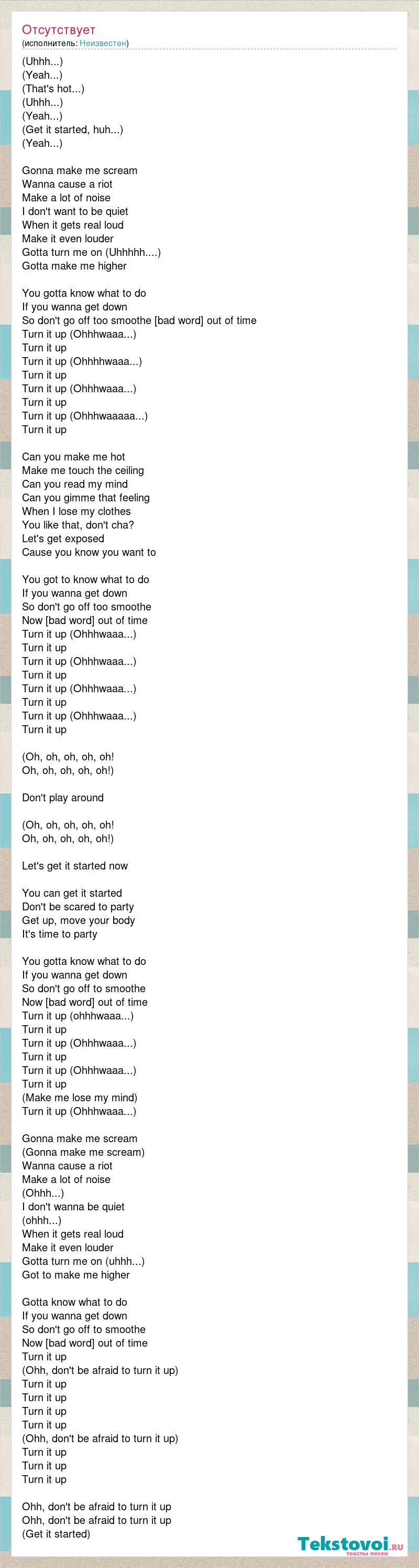 (Uhhh...) (Yeah...) (That's hot...) (Uhhh...) (Yeah...) (Get it started, huh...) (Yeah...) Gonna make me scream Wanna cause a riot Make a lot of noise I don't want to be quiet When it gets real loud Make it even louder Gotta turn me on (Uhhhhh....) Gotta make me higher You gotta know what to do If you wanna get down So don't go off too smoothe [bad word] out of time Turn it up (Ohhhwaaa...) Turn it up Turn it up (Ohhhhwaaa...) Turn it up Turn it up (Ohhhwaaa...) Turn it up Turn it up (Ohhhwaaaaa...) Turn it up Can you make me hot Make me touch the ceiling Can you read my mind Can you gimme that feeling When I lose my clothes You like that, don't cha? Let's get exposed Cause you know you want to You got to know what to do If you wanna get down So don't go off too smoothe Now [bad word] out of time Turn it up (Ohhhwaaa...) Turn it up Turn it up (Ohhhwaaa...) Turn it up Turn it up (Ohhhwaaa...) Turn it up Turn it up (Ohhhwaaa...) Turn it up (Oh, oh, oh, oh, oh! Oh, oh, oh, oh, oh!) Don't play around (Oh, oh, oh, oh, oh! Oh, oh, oh, oh, oh!) Let's get it started now You can get it started Don't be scared to party Get up, move your body It's time to party You gotta know what to do If you wanna get down So don't go off to smoothe Now [bad word] out of time Turn it up (ohhhwaaa...) Turn it up Turn it up (Ohhhwaaa...) Turn it up Turn it up (Ohhhwaaa...) Turn it up (Make me lose my mind) Turn it up (Ohhhwaaa...) Gonna make me scream (Gonna make me scream) Wanna cause a riot Make a lot of noise (Ohhh...) I don't wanna be quiet (ohhh...) When it gets real loud Make it even louder Gotta turn me on (uhhh...) Got to make me higher Gotta know what to do If you wanna get down So don't go off to smoothe Now [bad word] out of time Turn it up (Ohh, don't be afraid to turn it up) Turn it up Turn it up Turn it up Turn it up (Ohh, don't be afraid to turn it up) Turn it up Turn it up Turn it up Ohh, don't be afraid to turn it up Ohh, don't be afraid to turn it up (Get it started)