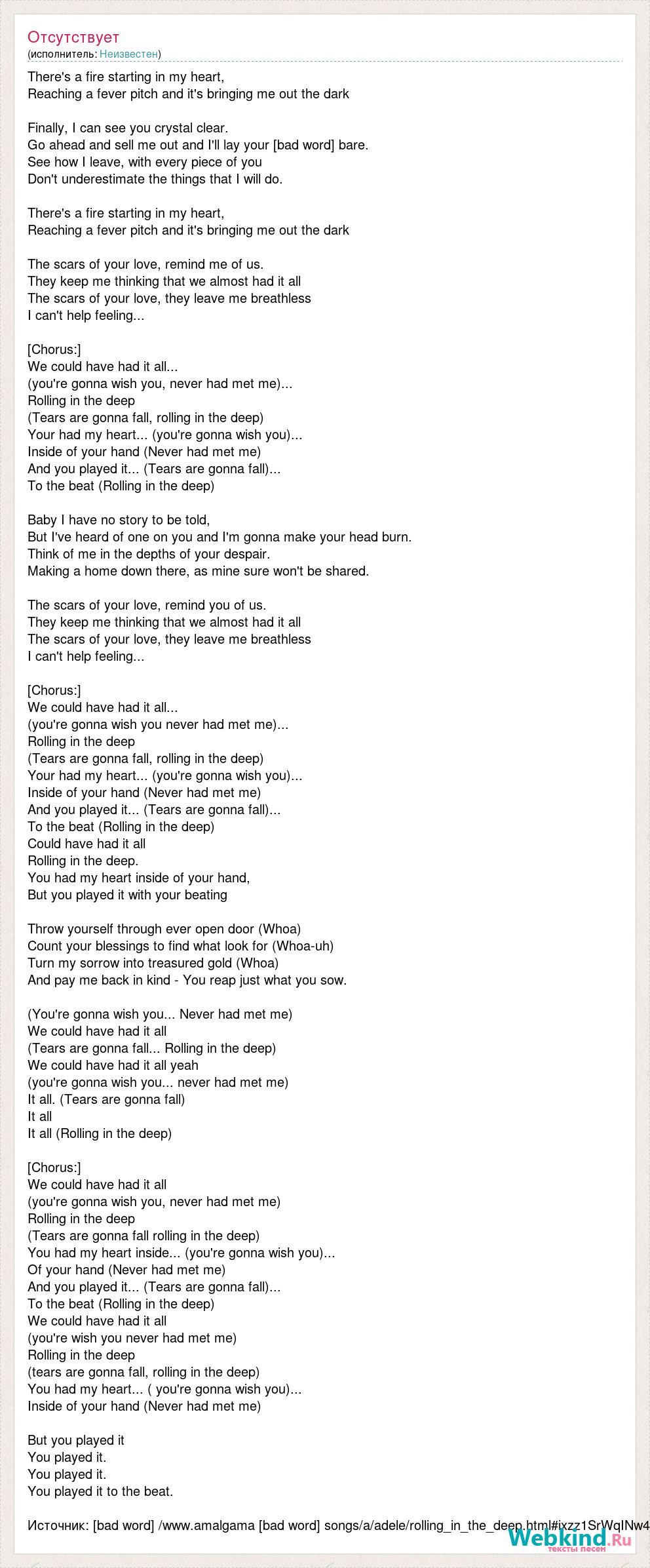 There's a fire starting in my heart, Reaching a fever pitch and it's bringing me out the dark Finally, I can see you crystal clear. Go ahead and sell me out and I'll lay your [bad word] bare. See how I leave, with every piece of you Don't underestimate the things that I will do. There's a fire starting in my heart, Reaching a fever pitch and it's bringing me out the dark The scars of your love, remind me of us. They keep me thinking that we almost had it all The scars of your love, they leave me breathless I can't help feeling... [bad word] ] We could have had it all... (you're gonna wish you, never had met me)... Rolling in the deep (Tears are gonna fall, rolling in the deep) Your had my heart... (you're gonna wish you)... Inside of your hand (Never had met me) And you played it... (Tears are gonna fall)... To the beat (Rolling in the deep) Baby I have no story to be told, But I've heard of one on you and I'm gonna make your head burn. Think of me in the depths of your despair. Making a home down there, as mine sure won't be shared. The scars of your love, remind you of us. They keep me thinking that we almost had it all The scars of your love, they leave me breathless I can't help feeling... [bad word] ] We could have had it all... (you're gonna wish you never had met me)... Rolling in the deep (Tears are gonna fall, rolling in the deep) Your had my heart... (you're gonna wish you)... Inside of your hand (Never had met me) And you played it... (Tears are gonna fall)... To the beat (Rolling in the deep) Could have had it all Rolling in the deep. You had my heart inside of your hand, But you played it with your beating Throw yourself through ever open door (Whoa) Count your blessings to find what look for (Whoa-uh) Turn my sorrow into treasured gold (Whoa) And pay me back in kind - You reap just what you sow. (You're gonna wish you... Never had met me) We could have had it all (Tears are gonna fall... Rolling in the deep) We could have had it all yeah (you're gonna wish you... never had met me) It all. (Tears are gonna fall) It all It all (Rolling in the deep) [bad word] ] We could have had it all (you're gonna wish you, never had met me) Rolling in the deep (Tears are gonna fall rolling in the deep) You had my heart inside... (you're gonna wish you)... Of your hand (Never had met me) And you played it... (Tears are gonna fall)... To the beat (Rolling in the deep) We could have had it all (you're wish you never had met me) Rolling in the deep (tears are gonna fall, rolling in the deep) You had my heart... ( you're gonna wish you)... Inside of your hand (Never had met me) But you played it You played it. You played it. You played it to the beat. Источник: [bad word] /www.amalgama [bad word] songs/a/adele/rolling_in_the_deep.html#ixzz1SrWqINw4