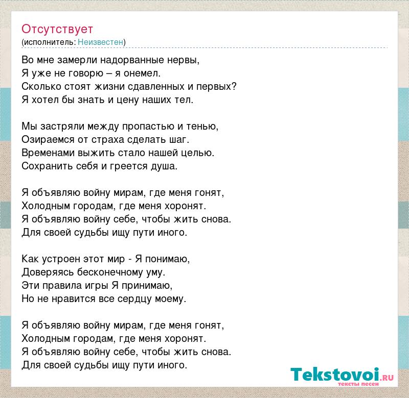 Во мне замерли надорванные нервы, Я уже не говорю – я онемел. Сколько стоят жизни сдавленных и первых? Я хотел бы знать и цену наших тел. Мы застряли между пропастью и тенью, Озираемся от страха сделать шаг. Временами выжить стало нашей целью. Сохранить себя и греется душа. Я объявляю войну мирам, где меня гонят, Холодным городам, где меня хоронят. Я объявляю войну себе, чтобы жить снова. Для своей судьбы ищу пути иного. Как устроен этот мир - Я понимаю, Доверяясь бесконечному уму. Эти правила игры Я принимаю, Но не нравится все сердцу моему. Я объявляю войну мирам, где меня гонят, Холодным городам, где меня хоронят. Я объявляю войну себе, чтобы жить снова. Для своей судьбы ищу пути иного.