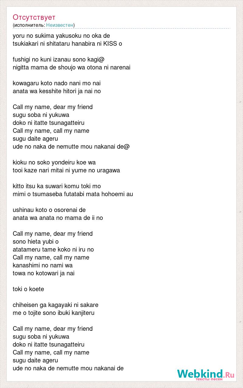 [bad word] no sukima yakusoku no oka de tsukiakari ni [bad word] hanabira ni KISS o fushigi no kuni izanau sono kagi@ nigitta mama de shoujo wa otona ni narenai [bad word] koto nado nani mo nai anata wa [bad word] hitori ja nai no Call my name, dear my friend sugu soba ni yukuwa doko ni itatte [bad word] Call my name, call my name sugu daite [bad word] ude no naka de nemutte mou nakanai de@ kioku no soko [bad word] koe wa tooi kaze nari mitai ni yume no uragawa kitto itsu ka suwari komu toki mo mimi o tsumaseba futatabi mata hohoemi au ushinau koto o osorenai de anata wa anata no mama de ii no Call my name, dear my friend sono hieta yubi o [bad word] tame koko ni [bad word] no Call my name, call my name kanashimi no nami wa towa no kotowari ja nai toki o koete chiheisen ga kagayaki ni sakare me o tojite sono ibuki [bad word] Call my name, dear my friend sugu soba ni yukuwa doko ni itatte [bad word] Call my name, call my name sugu daite [bad word] ude no naka de nemutte mou nakanai de