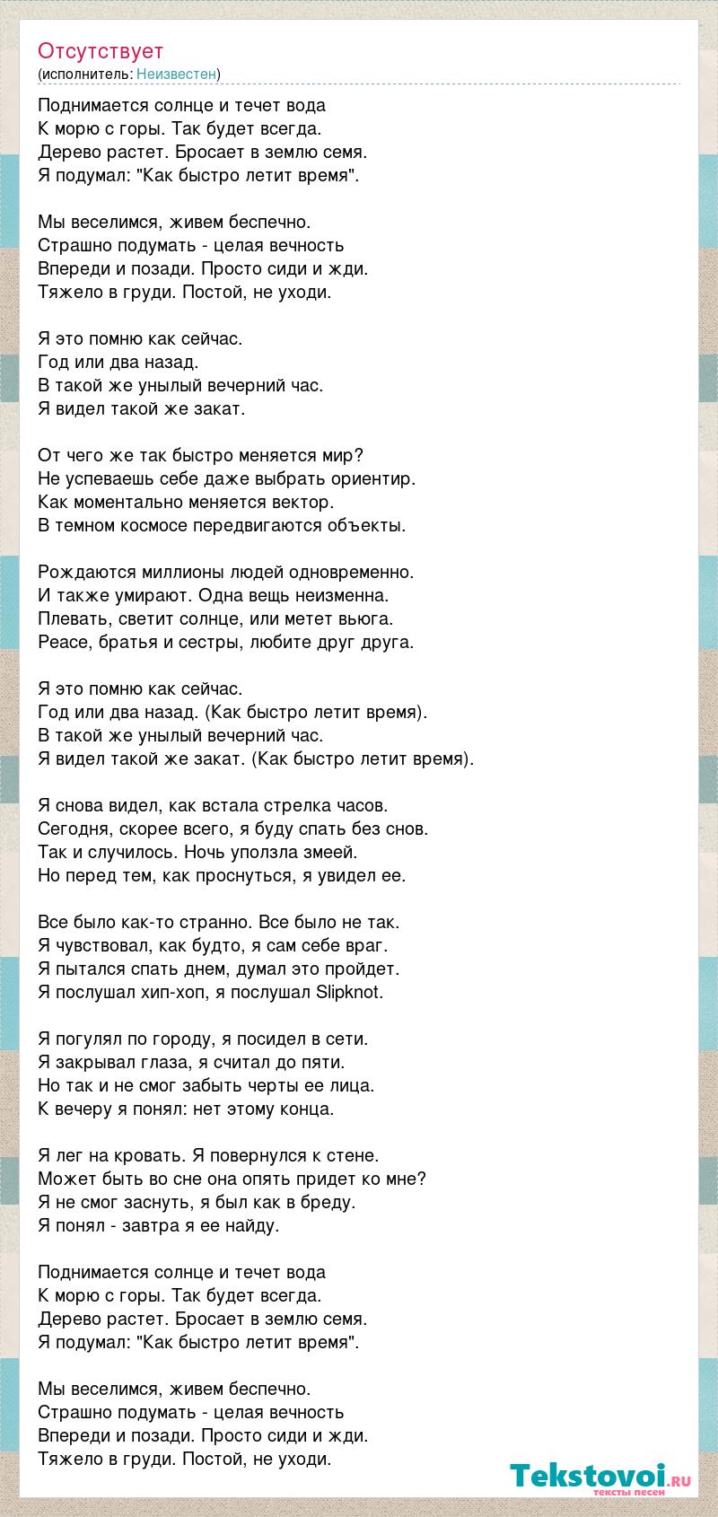 Поднимается солнце и течет вода К морю с горы. Так будет всегда. Дерево растет. Бросает в землю семя. Я подумал: "Как быстро летит время". Мы веселимся, живем беспечно. Страшно подумать - целая вечность Впереди и позади. Просто сиди и жди. Тяжело в груди. Постой, не уходи. Я это помню как сейчас. Год или два назад. В такой же унылый вечерний час. Я видел такой же закат. От чего же так быстро меняется мир? Не успеваешь себе даже выбрать ориентир. Как моментально меняется вектор. В темном космосе передвигаются объекты. Рождаются миллионы людей одновременно. И также умирают. Одна вещь неизменна. Плевать, светит солнце, или метет вьюга. Peace, братья и сестры, любите друг друга. Я это помню как сейчас. Год или два назад. (Как быстро летит время). В такой же унылый вечерний час. Я видел такой же закат. (Как быстро летит время). Я снова видел, как встала стрелка часов. Сегодня, скорее всего, я буду спать без снов. Так и случилось. Ночь уползла змеей. Но перед тем, как проснуться, я увидел ее. Все было как-то странно. Все было не так. Я чувствовал, как будто, я сам себе враг. Я пытался спать днем, думал это пройдет. Я послушал хип-хоп, я послушал Slipknot. Я погулял по городу, я посидел в сети. Я закрывал глаза, я считал до пяти. Но так и не смог забыть черты ее лица. К вечеру я понял: нет этому конца. Я лег на кровать. Я повернулся к стене. Может быть во сне она опять придет ко мне? Я не смог заснуть, я был как в бреду. Я понял - завтра я ее найду. Поднимается солнце и течет вода К морю с горы. Так будет всегда. Дерево растет. Бросает в землю семя. Я подумал: "Как быстро летит время". Мы веселимся, живем беспечно. Страшно подумать - целая вечность Впереди и позади. Просто сиди и жди. Тяжело в груди. Постой, не уходи.