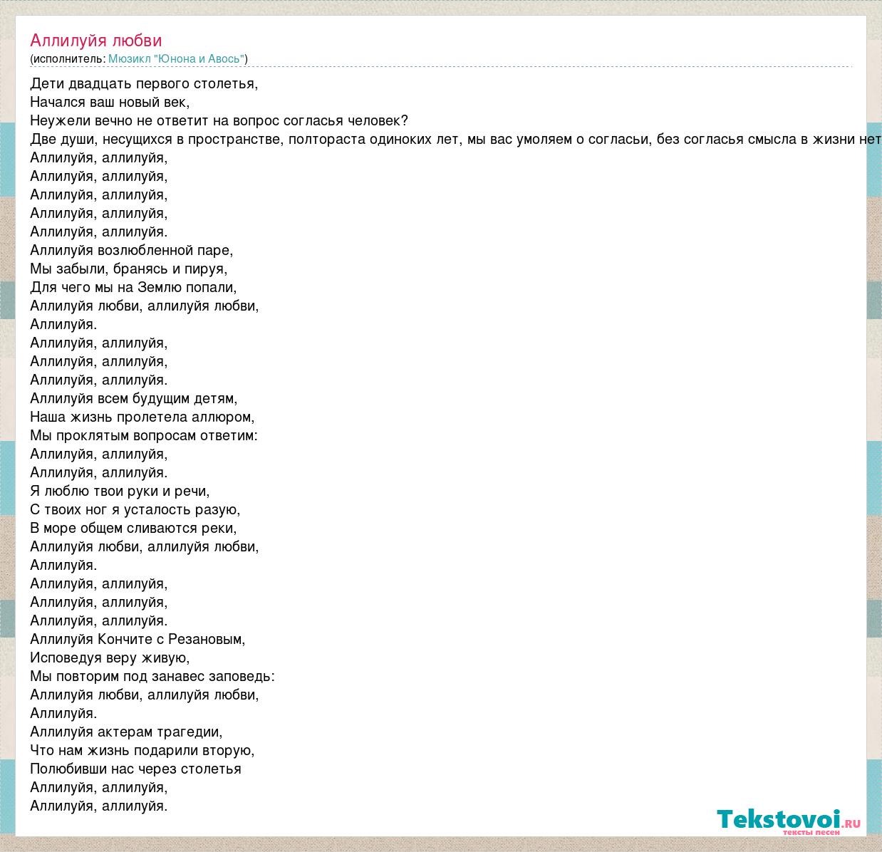 Дети двадцать первого столетья, Начался ваш новый век, Неужели вечно не ответит на вопрос согласья человек? Две души, несущихся в пространстве, полтораста одиноких лет, мы вас умоляем о согласьи, без согласья смысла в жизни нет Аллилуйя, аллилуйя, Аллилуйя, аллилуйя, Аллилуйя, аллилуйя, Аллилуйя, аллилуйя, Аллилуйя, аллилуйя. Аллилуйя возлюбленной паре, Мы забыли, бранясь и пируя, Для чего мы на Землю попали, Аллилуйя любви, аллилуйя любви, Аллилуйя. Аллилуйя, аллилуйя, Аллилуйя, аллилуйя, Аллилуйя, аллилуйя. Аллилуйя всем будущим детям, Наша жизнь пролетела аллюром, Мы проклятым вопросам ответим: Аллилуйя, аллилуйя, Аллилуйя, аллилуйя. Я люблю твои руки и речи, С твоих ног я усталость разую, В море общем сливаются реки, Аллилуйя любви, аллилуйя любви, Аллилуйя. Аллилуйя, аллилуйя, Аллилуйя, аллилуйя, Аллилуйя, аллилуйя. Аллилуйя Кончите с Резановым, Исповедуя веру живую, Мы повторим под занавес заповедь: Аллилуйя любви, аллилуйя любви, Аллилуйя. Аллилуйя актерам трагедии, Что нам жизнь подарили вторую, Полюбивши нас через столетья Аллилуйя, аллилуйя, Аллилуйя, аллилуйя.