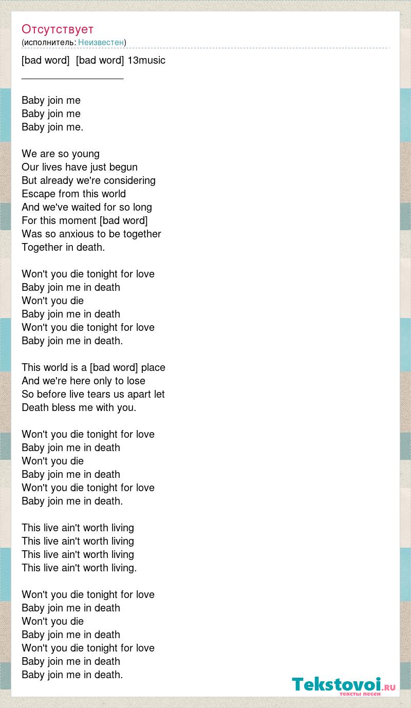 [bad word] [bad word] 13music __________________ Baby join me Baby join me Baby join me. We are so young Our lives have just begun But already we're considering Escape from this world And we've waited for so long For this moment [bad word] Was so anxious to be together Together in death. Won't you die tonight for love Baby join me in death Won't you die Baby join me in death Won't you die tonight for love Baby join me in death. This world is a [bad word] place And we're here only to lose So before live tears us apart let Death bless me with you. Won't you die tonight for love Baby join me in death Won't you die Baby join me in death Won't you die tonight for love Baby join me in death. This live ain't worth living This live ain't worth living This live ain't worth living This live ain't worth living. Won't you die tonight for love Baby join me in death Won't you die Baby join me in death Won't you die tonight for love Baby join me in death Baby join me in death.