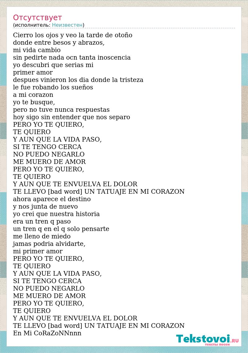 Cierro los ojos y veo la tarde de otoño donde entre besos y abrazos, mi vida cambio sin pedirte nada ocn tanta inoscencia yo descubri que serias mi primer amor despues vinieron los dia donde la tristeza le fue robando los sueños a mi corazon yo te busque, pero no tuve nunca respuestas hoy sigo sin entender que nos separo PERO YO TE QUIERO, TE QUIERO Y AUN QUE LA VIDA PASO, SI TE TENGO CERCA NO PUEDO NEGARLO ME MUERO DE AMOR PERO YO TE QUIERO, TE QUIERO Y AUN QUE TE ENVUELVA EL DOLOR TE LLEVO [bad word] UN TATUAJE EN MI CORAZON ahora aparece el destino y nos junta de nuevo yo crei que nuestra historia era un tren q paso un tren q en el q solo pensarte me lleno de miedo jamas podria alvidarte, mi primer amor PERO YO TE QUIERO, TE QUIERO Y AUN QUE LA VIDA PASO, SI TE TENGO CERCA NO PUEDO NEGARLO ME MUERO DE AMOR PERO YO TE QUIERO, TE QUIERO Y AUN QUE TE ENVUELVA EL DOLOR TE LLEVO [bad word] UN TATUAJE EN MI CORAZON En Mi CoRaZoNNnnn