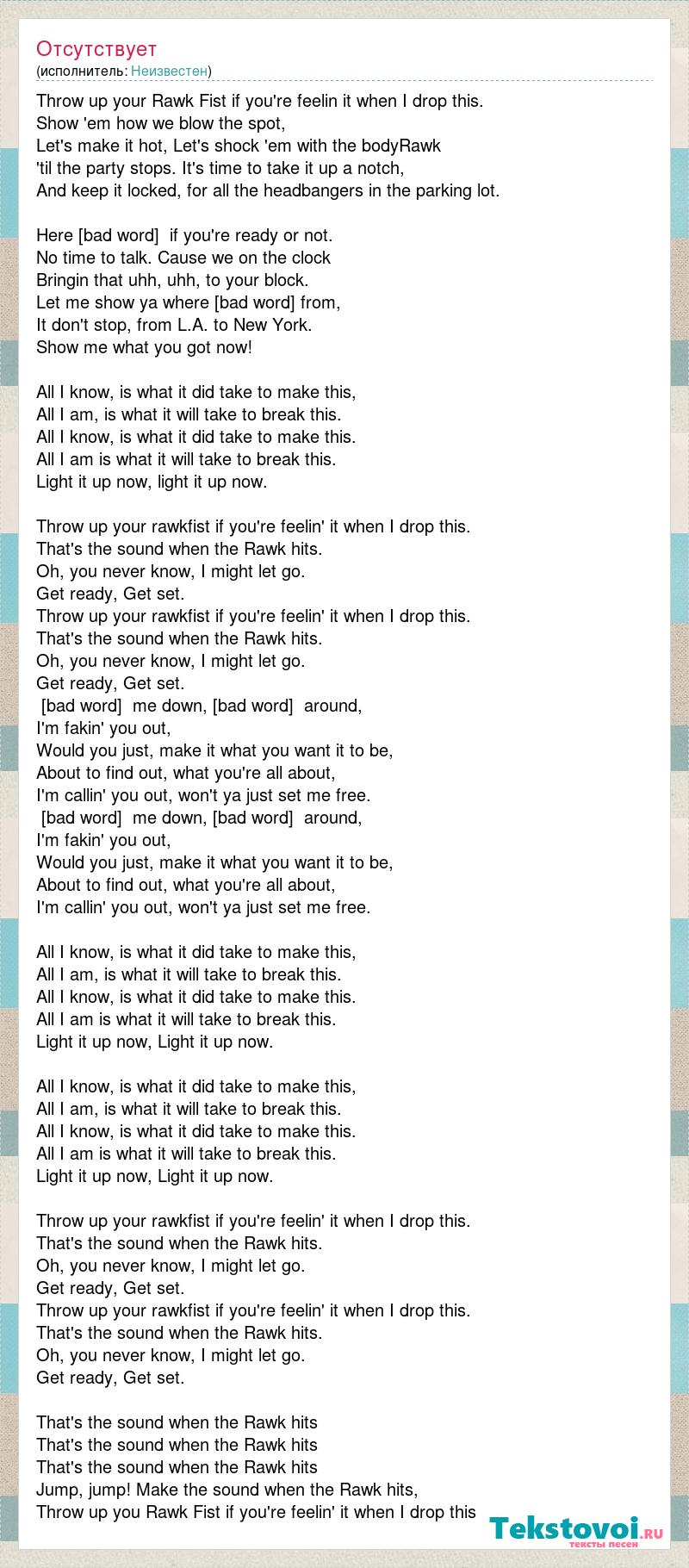 Throw up your Rawk Fist if you're feelin it when I drop this. Show 'em how we blow the spot, Let's make it hot, Let's shock 'em with the bodyRawk 'til the party stops. It's time to take it up a notch, And keep it locked, for all the headbangers in the parking lot. Here [bad word] if you're ready or not. No time to talk. Cause we on the clock Bringin that uhh, uhh, to your block. Let me show ya where [bad word] from, It don't stop, from L.A. to New York. Show me what you got now! All I know, is what it did take to make this, All I am, is what it will take to break this. All I know, is what it did take to make this. All I am is what it will take to break this. Light it up now, light it up now. Throw up your rawkfist if you're feelin' it when I drop this. That's the sound when the Rawk hits. Oh, you never know, I might let go. Get ready, Get set. Throw up your rawkfist if you're feelin' it when I drop this. That's the sound when the Rawk hits. Oh, you never know, I might let go. Get ready, Get set. [bad word] me down, [bad word] around, I'm fakin' you out, Would you just, make it what you want it to be, About to find out, what you're all about, I'm callin' you out, won't ya just set me free. [bad word] me down, [bad word] around, I'm fakin' you out, Would you just, make it what you want it to be, About to find out, what you're all about, I'm callin' you out, won't ya just set me free. All I know, is what it did take to make this, All I am, is what it will take to break this. All I know, is what it did take to make this. All I am is what it will take to break this. Light it up now, Light it up now. All I know, is what it did take to make this, All I am, is what it will take to break this. All I know, is what it did take to make this. All I am is what it will take to break this. Light it up now, Light it up now. Throw up your rawkfist if you're feelin' it when I drop this. That's the sound when the Rawk hits. Oh, you never know, I might let go. Get ready, Get set. Throw up your rawkfist if you're feelin' it when I drop this. That's the sound when the Rawk hits. Oh, you never know, I might let go. Get ready, Get set. That's the sound when the Rawk hits That's the sound when the Rawk hits That's the sound when the Rawk hits Jump, jump! Make the sound when the Rawk hits, Throw up you Rawk Fist if you're feelin' it when I drop this