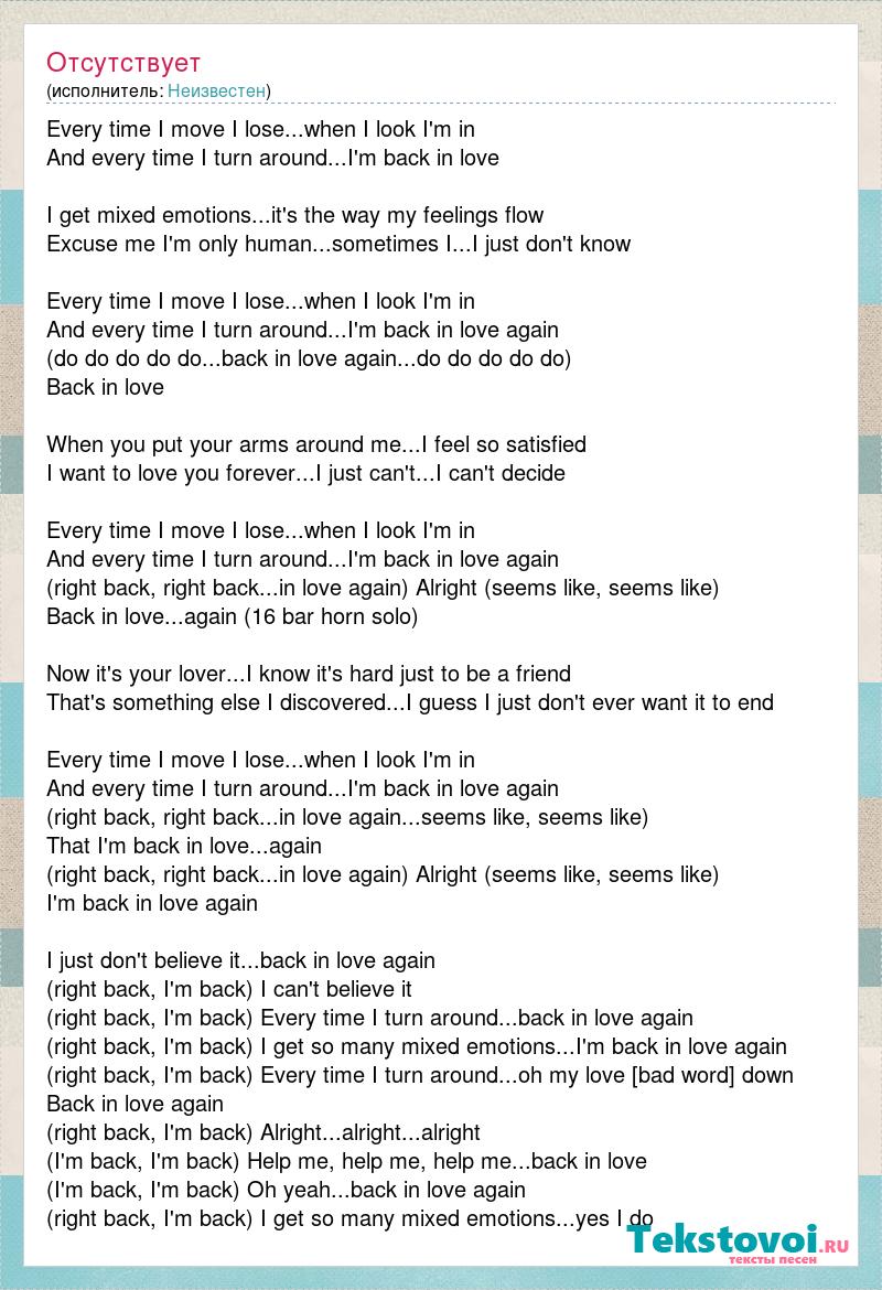 Every time I move I lose...when I look I'm in And every time I turn around...I'm back in love I get mixed emotions...it's the way my feelings flow Excuse me I'm only human...sometimes I...I just don't know Every time I move I lose...when I look I'm in And every time I turn around...I'm back in love again (do do do do do...back in love again...do do do do do) Back in love When you put your arms around me...I feel so satisfied I want to love you forever...I just can't...I can't decide Every time I move I lose...when I look I'm in And every time I turn around...I'm back in love again (right back, right back...in love again) Alright (seems like, seems like) Back in love...again (16 bar horn solo) Now it's your lover...I know it's hard just to be a friend That's something else I discovered...I guess I just don't ever want it to end Every time I move I lose...when I look I'm in And every time I turn around...I'm back in love again (right back, right back...in love again...seems like, seems like) That I'm back in love...again (right back, right back...in love again) Alright (seems like, seems like) I'm back in love again I just don't believe it...back in love again (right back, I'm back) I can't believe it (right back, I'm back) Every time I turn around...back in love again (right back, I'm back) I get so many mixed emotions...I'm back in love again (right back, I'm back) Every time I turn around...oh my love [bad word] down Back in love again (right back, I'm back) Alright...alright...alright (I'm back, I'm back) Help me, help me, help me...back in love (I'm back, I'm back) Oh yeah...back in love again (right back, I'm back) I get so many mixed emotions...yes I do