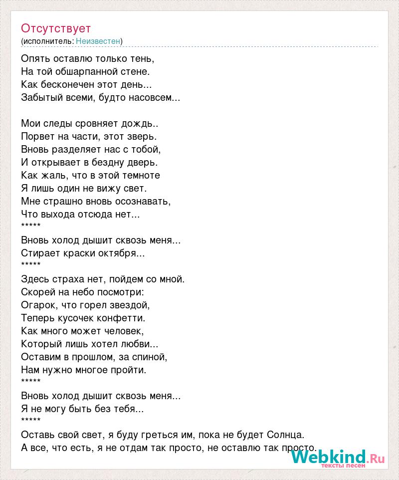 Опять оставлю только тень, На той обшарпанной стене. Как бесконечен этот день... Забытый всеми, будто насовсем... Мои следы сровняет дождь.. Порвет на части, этот зверь. Вновь разделяет нас с тобой, И открывает в бездну дверь. Как жаль, что в этой темноте Я лишь один не вижу свет. Мне страшно вновь осознавать, Что выхода отсюда нет... ***** Вновь холод дышит сквозь меня... Стирает краски октября... ***** Здесь страха нет, пойдем со мной. Скорей на небо посмотри: Огарок, что горел звездой, Теперь кусочек конфетти. Как много может человек, Который лишь хотел любви... Оставим в прошлом, за спиной, Нам нужно многое пройти. ***** Вновь холод дышит сквозь меня... Я не могу быть без тебя... ***** Оставь свой свет, я буду греться им, пока не будет Солнца. А все, что есть, я не отдам так просто, не оставлю так просто.