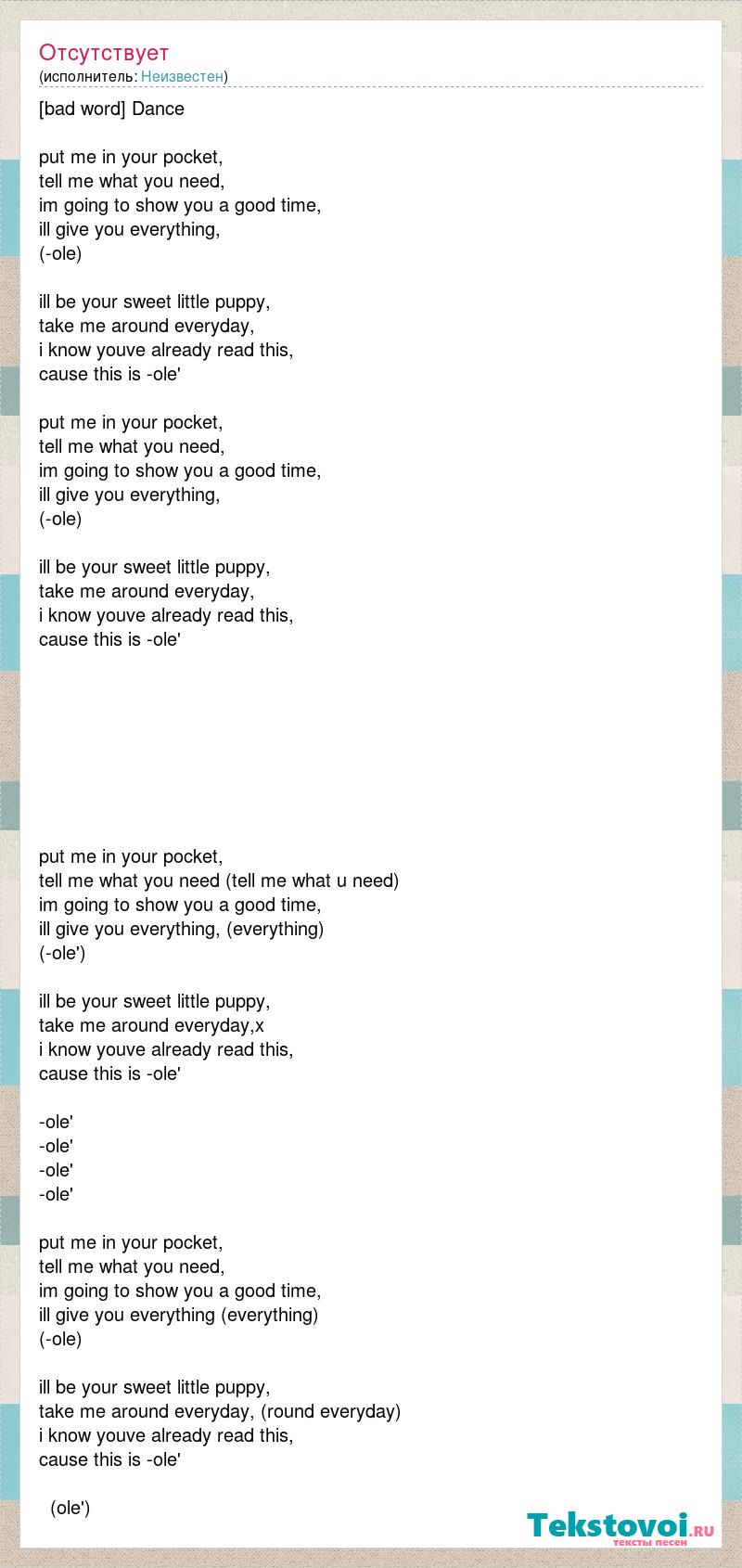 [bad word] Dance put me in your pocket, tell me what you need, im going to show you a good time, ill give you everything, (-ole) ill be your sweet little puppy, take me around everyday, i know youve already read this, cause this is -ole' put me in your pocket, tell me what you need, im going to show you a good time, ill give you everything, (-ole) ill be your sweet little puppy, take me around everyday, i know youve already read this, cause this is -ole' put me in your pocket, tell me what you need (tell me what u need) im going to show you a good time, ill give you everything, (everything) (-ole') ill be your sweet little puppy, take me around everyday,x i know youve already read this, cause this is -ole' -ole' -ole' -ole' -ole' put me in your pocket, tell me what you need, im going to show you a good time, ill give you everything (everything) (-ole) ill be your sweet little puppy, take me around everyday, (round everyday) i know youve already read this, cause this is -ole' (ole')