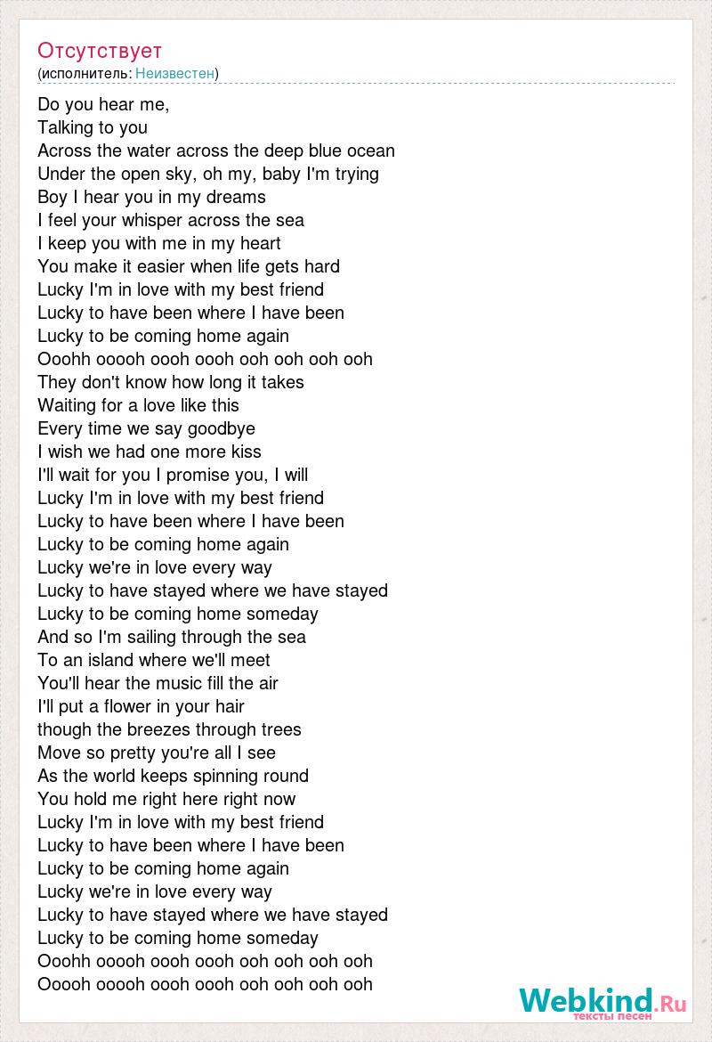 Do you hear me, Talking to you Across the water across the deep blue ocean Under the open sky, oh my, baby I'm trying Boy I hear you in my dreams I feel your whisper across the sea I keep you with me in my heart You make it easier when life gets hard Lucky I'm in love with my best friend Lucky to have been where I have been Lucky to [bad word] home again Ooohh ooooh oooh oooh ooh ooh ooh ooh They don't know how long it takes Waiting for a love like this Every time we say goodbye I wish we had one more kiss I'll wait for you I promise you, I will Lucky I'm in love with my best friend Lucky to have been where I have been Lucky to [bad word] home again Lucky we're in love every way Lucky to have stayed where we have stayed Lucky to [bad word] home someday And so I'm sailing through the sea To an island where we'll meet You'll hear the music fill the air I'll put a flower in your hair though the breezes through trees Move so pretty you're all I see As the world keeps spinning round You hold me right here right now Lucky I'm in love with my best friend Lucky to have been where I have been Lucky to [bad word] home again Lucky we're in love every way Lucky to have stayed where we have stayed Lucky to [bad word] home someday Ooohh ooooh oooh oooh ooh ooh ooh ooh Ooooh ooooh oooh oooh ooh ooh ooh ooh