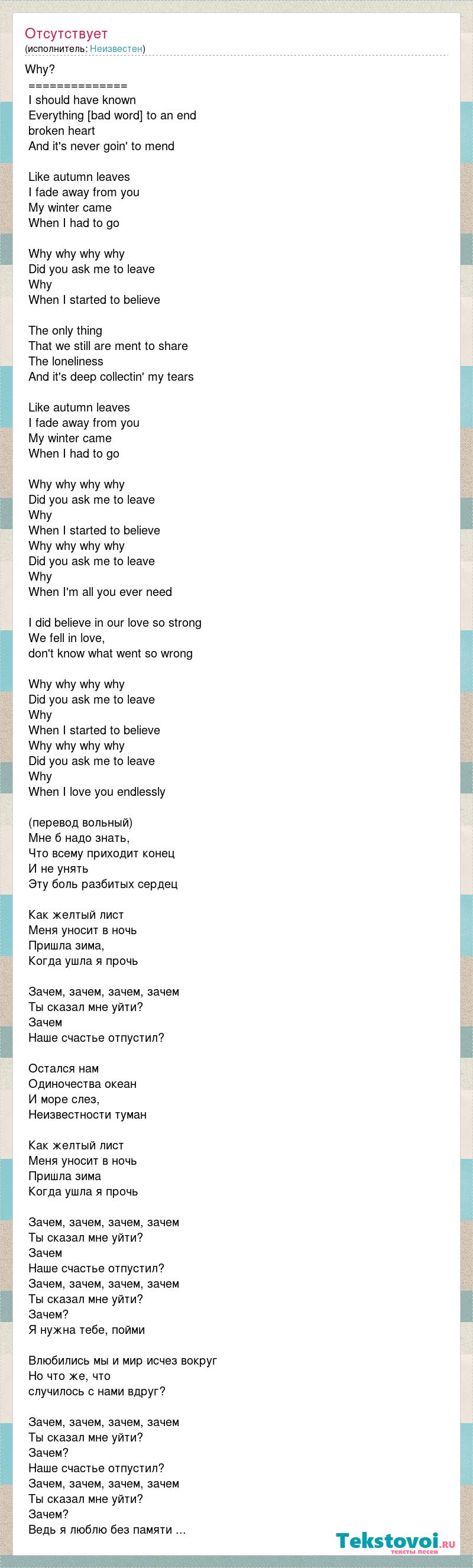 Why? ============== I should have known Everything [bad word] to an end broken heart And it's never goin' to mend Like autumn leaves I fade away from you My winter came When I had to go Why why why why Did you ask me to leave Why When I started to believe The only thing That we still are ment to share The loneliness And it's deep collectin' my tears Like autumn leaves I fade away from you My winter came When I had to go Why why why why Did you ask me to leave Why When I started to believe Why why why why Did you ask me to leave Why When I'm all you ever need I did believe in our love so strong We fell in love, don't know what went so wrong Why why why why Did you ask me to leave Why When I started to believe Why why why why Did you ask me to leave Why When I love you endlessly (перевод вольный) Мне б надо знать, Что всему приходит конец И не унять Эту боль разбитых сердец Как желтый лист Меня уносит в ночь Пришла зима, Когда ушла я прочь Зачем, зачем, зачем, зачем Ты сказал мне уйти? Зачем Наше счастье отпустил? Остался нам Одиночества океан И море слез, Неизвестности туман Как желтый лист Меня уносит в ночь Пришла зима Когда ушла я прочь Зачем, зачем, зачем, зачем Ты сказал мне уйти? Зачем Наше счастье отпустил? Зачем, зачем, зачем, зачем Ты сказал мне уйти? Зачем? Я нужна тебе, пойми Влюбились мы и мир исчез вокруг Но что же, что случилось с нами вдруг? Зачем, зачем, зачем, зачем Ты сказал мне уйти? Зачем? Наше счастье отпустил? Зачем, зачем, зачем, зачем Ты сказал мне уйти? Зачем? Ведь я люблю без памяти ...