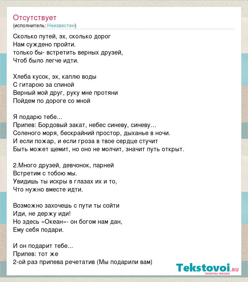 Сколько путей, эх, сколько дорог Нам суждено пройти. только бы- встретить верных друзей, Чтоб было легче идти. Хлеба кусок, эх, каплю воды С гитарою за спиной Верный мой друг, руку мне протяни Пойдем по дороге со мной Я подарю тебе... Припев: Бордовый закат, небес синеву, синеву… Соленого моря, бескрайний простор, дыханье в ночи. И если пожар, и если гроза в твое сердце стучит Быть может щемит, но оно не молчит, значит путь открыт. 2.Много друзей, девчонок, парней Встретим с тобою мы. Увидишь ты искры в глазах их и то, Что нужно вместе идти. Возможно захочешь с пути ты сойти Иди, не держу иди! Но здесь «Океан»- он богом нам дан, Ему себя подари. И он подарит тебе... Припев: тот же 2-ой раз припева речетатив (Мы подарили вам)