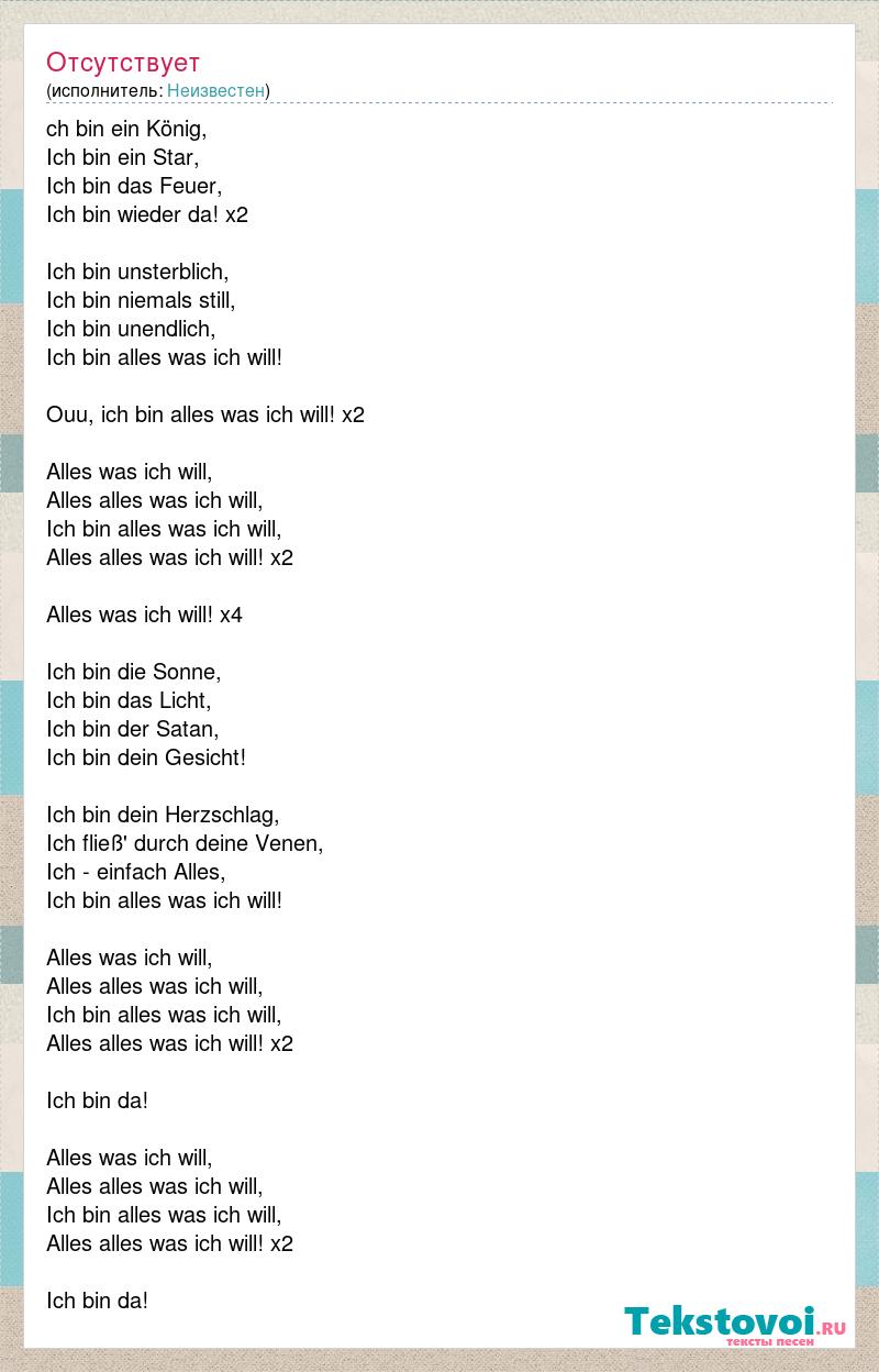 ch bin ein König, Ich bin ein Star, Ich bin das Feuer, Ich bin wieder da! x2 Ich bin unsterblich, Ich bin niemals still, Ich bin unendlich, Ich bin alles was ich will! Ouu, ich bin alles was ich will! x2 Alles was ich will, Alles alles was ich will, Ich bin alles was ich will, Alles alles was ich will! x2 Alles was ich will! x4 Ich bin die Sonne, Ich bin das Licht, Ich bin der Satan, Ich bin dein Gesicht! Ich bin dein Herzschlag, Ich fließ' durch deine Venen, Ich - einfach Alles, Ich bin alles was ich will! Alles was ich will, Alles alles was ich will, Ich bin alles was ich will, Alles alles was ich will! x2 Ich bin da! Alles was ich will, Alles alles was ich will, Ich bin alles was ich will, Alles alles was ich will! x2 Ich bin da!