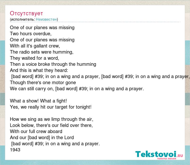 One of our planes was missing Two hours overdue, One of our planes was missing With all it's gallant crew, The radio sets were humming, They waited for a word, Then a voice broke through the humming And this is what they heard: [bad word] #39; in on a wing and a prayer, [bad word] #39; in on a wing and a prayer, Though there's one motor gone We can still carry on, [bad word] #39; in on a wing and a prayer. What a show! What a fight! Yes, we really hit our target for tonight! How we sing as we limp through the air, Look below, there's our field over there, With our full crew aboard And our [bad word] in the Lord [bad word] #39; in on a wing and a prayer. 1943