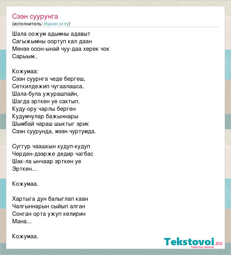 Шала оожум адымны адавыт Сагыжымны оортуп кал даан Менээ ооон-ынай чуу-даа херек чок Сарыым.. Кожумаа: Сээн суурнга чеде бергеш, Сеткилдежип чугаалашса. Шала-була ужурашпайн, Шагда эрткен уе сактып. Куду-ору чарлы берген Кудумчулар бажыннары Шымбай чараш шыктыг эрик Сээн суурунда, мээн чуртумда. Суггур чаашкын кудуп-кудуп Черден-дээрже дедир чагбас Шак-ла ынчаар эрткен уе Эрткен... Кожумаа. Хартыга дун балыглап каан Чалгыннарын сыйып алган Сонган орта ужуп келирин Мана... Кожумаа.