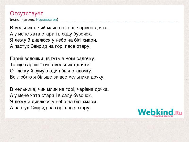 В мельника, чий млин на горі, чарівна дочка. А у мене хата стара і в саду бузочок. Я лежу й дивлюся у небо на білі хмари. А пастух Свирид на горі пасе отару. Гарнії волошки цвітуть в моїм садочку. Та іще гарнішії очі в мельника дочки. От лежу й сумую один біля ставочку, Бо люблю я більше за все мельника дочку. В мельника, чий млин на горі, чарівна дочка. А у мене хата стара і в саду бузочок. Я лежу й дивлюся у небо на білі хмари. А пастух Свирид на горі пасе отару.