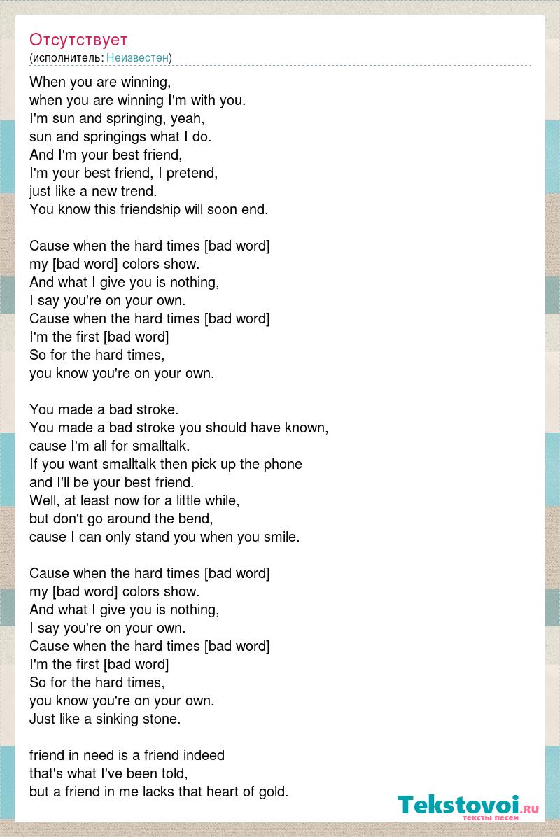 When you are winning, when you are winning I'm with you. I'm sun and springing, yeah, sun and springings what I do. And I'm your best friend, I'm your best friend, I pretend, just like a new trend. You know this friendship will soon end. Cause when the hard times [bad word] my [bad word] colors show. And what I give you is nothing, I say you're on your own. Cause when the hard times [bad word] I'm the first [bad word] So for the hard times, you know you're on your own. You made a bad stroke. You made a bad stroke you should have known, cause I'm all for smalltalk. If you want smalltalk then pick up the phone and I'll be your best friend. Well, at least now for a little while, but don't go around the bend, cause I can only stand you when you smile. Cause when the hard times [bad word] my [bad word] colors show. And what I give you is nothing, I say you're on your own. Cause when the hard times [bad word] I'm the first [bad word] So for the hard times, you know you're on your own. Just like a sinking stone. friend in need is a friend indeed that's what I've been told, but a friend in me lacks that heart of gold.