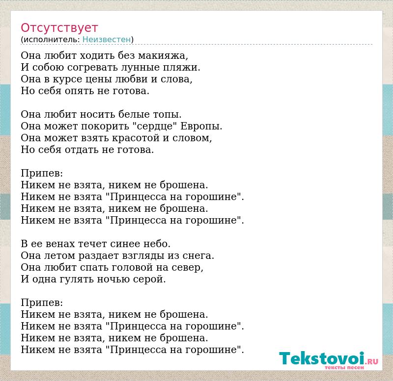 Она любит ходить без макияжа, И собою согревать лунные пляжи. Она в курсе цены любви и слова, Но себя опять не готова. Она любит носить белые топы. Она может покорить "сердце" Европы. Она может взять красотой и словом, Но себя отдать не готова. Припев: Никем не взята, никем не брошена. Никем не взята "Принцесса на горошине". Никем не взята, никем не брошена. Никем не взята "Принцесса на горошине". В ее венах течет синее небо. Она летом раздает взгляды из снега. Она любит спать головой на север, И одна гулять ночью серой. Припев: Никем не взята, никем не брошена. Никем не взята "Принцесса на горошине". Никем не взята, никем не брошена. Никем не взята "Принцесса на горошине".
