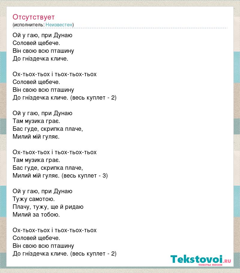 Ой у гаю, при Дунаю Соловей щебече. Він свою всю пташину До гніздечка кличе. Ох-тьох-тьох і тьох-тьох-тьох Соловей щебече. Він свою всю пташину До гніздечка кличе. (весь куплет - 2) Ой у гаю, при Дунаю Там музика грає. Бас гуде, скрипка плаче, Милий мій гуляє. Ох-тьох-тьох і тьох-тьох-тьох Там музика грає. Бас гуде, скрипка плаче, Милий мiй гуляє. (весь куплет - 3) Ой у гаю, при Дунаю Тужу самотою. Плачу, тужу, ще й ридаю Милий за тобою. Ох-тьох-тьох і тьох-тьох-тьох Соловей щебече. Він свою всю пташину До гніздечка кличе. (весь куплет - 2)