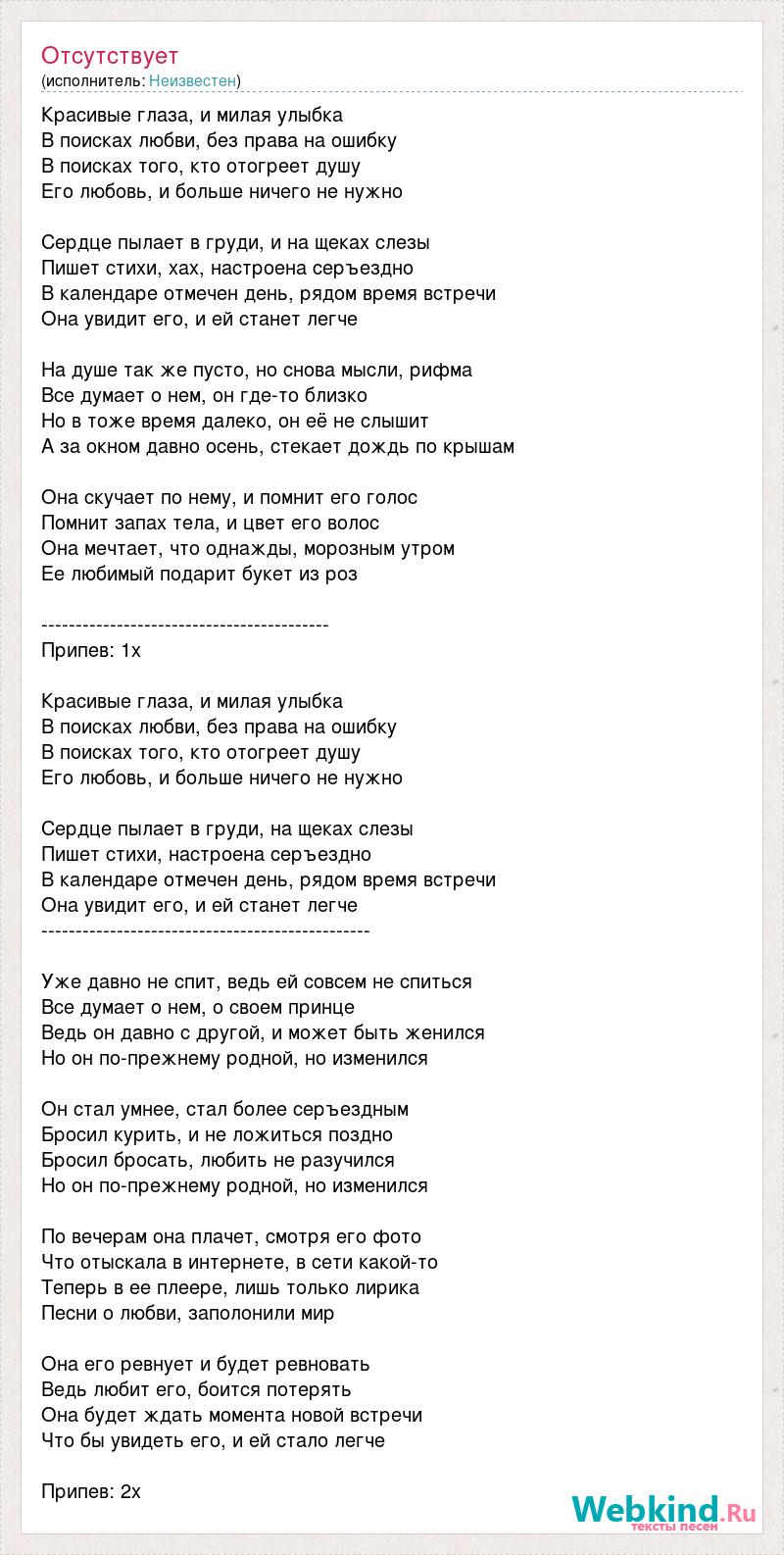 Красивые глаза, и милая улыбка В поисках любви, без права на ошибку В поисках того, кто отогреет душу Его любовь, и больше ничего не нужно Сердце пылает в груди, и на щеках слезы Пишет стихи, хах, настроена серъездно В календаре отмечен день, рядом время встречи Она увидит его, и ей станет легче На душе так же пусто, но снова мысли, рифма Все думает о нем, он где-то близко Но в тоже время далеко, он её не слышит А за окном давно осень, стекает дождь по крышам Она скучает по нему, и помнит его голос Помнит запах тела, и цвет его волос Она мечтает, что однажды, морозным утром Ее любимый подарит букет из роз ------------------------------------------ Припев: 1х Красивые глаза, и милая улыбка В поисках любви, без права на ошибку В поисках того, кто отогреет душу Его любовь, и больше ничего не нужно Сердце пылает в груди, на щеках слезы Пишет стихи, настроена серъездно В календаре отмечен день, рядом время встречи Она увидит его, и ей станет легче ------------------------------------------------ Уже давно не спит, ведь ей совсем не спиться Все думает о нем, о своем принце Ведь он давно с другой, и может быть женился Но он по-прежнему родной, но изменился Он стал умнее, стал более серъездным Бросил курить, и не ложиться поздно Бросил бросать, любить не разучился Но он по-прежнему родной, но изменился По вечерам она плачет, смотря его фото Что отыскала в интернете, в сети какой-то Теперь в ее плеере, лишь только лирика Песни о любви, заполонили мир Она его ревнует и будет ревновать Ведь любит его, боится потерять Она будет ждать момента новой встречи Что бы увидеть его, и ей стало легче Припев: 2х