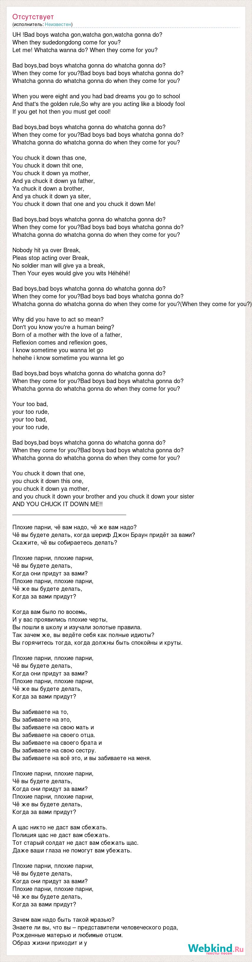 UH !Bad boys watcha gon,watcha gon,watcha gonna do? When they [bad word] for you? Let me! Whatcha wanna do? When [bad word] for you? Bad boys,bad boys whatcha gonna do whatcha gonna do? When [bad word] for you?Bad boys bad boys whatcha gonna do? Whatcha gonna do whatcha gonna do when [bad word] for you? When you were eight and you had bad dreams you go to school And that's the [bad word] So why are you acting like a bloody fool If you get hot then you must get cool! Bad boys,bad boys whatcha gonna do whatcha gonna do? When [bad word] for you?Bad boys bad boys whatcha gonna do? Whatcha gonna do whatcha gonna do when [bad word] for you? You chuck it down thas one, You chuck it down thit one, You chuck it down ya mother, And ya chuck it down ya father, Ya chuck it down a brother, And ya chuck it down ya siter, You chuck it down that one and you chuck it down Me! Bad boys,bad boys whatcha gonna do whatcha gonna do? When [bad word] for you?Bad boys bad boys whatcha gonna do? Whatcha gonna do whatcha gonna do when [bad word] for you? Nobody hit ya over Break, Pleas stop acting over Break, No soldier man will give ya a break, Then Your eyes would give you wits Héhéhé! Bad boys,bad boys whatcha gonna do whatcha gonna do? When [bad word] for you?Bad boys bad boys whatcha gonna do? Whatcha gonna do whatcha gonna do when [bad word] for you?(When [bad word] for you?) Why did you have to act so mean? Don't you know you're a human being? Born of a mother with the love of a father, [bad word] and reflexion goes, I know sometime you wanna let go hehehe i know sometime you wanna let go Bad boys,bad boys whatcha gonna do whatcha gonna do? When [bad word] for you?Bad boys bad boys whatcha gonna do? Whatcha gonna do whatcha gonna do when [bad word] for you? Your too bad, your [bad word] your too bad, your [bad word] Bad boys,bad boys whatcha gonna do whatcha gonna do? When [bad word] for you?Bad boys bad boys whatcha gonna do? Whatcha gonna do whatcha gonna do when [bad word] for you? You chuck it down that one, you chuck it down this one, you chuck it down ya mother, and you chuck it down your brother and you chuck it down your sister AND YOU CHUCK IT DOWN ME!! ___________________________________ Плохие парни, чё вам надо, чё же вам надо? Чё вы будете делать, когда шериф Джон Браун придёт за вами? Скажите, чё вы собираетесь делать? Плохие парни, плохие парни, Чё вы будете делать, Когда они придут за вами? Плохие парни, плохие парни, Чё же вы будете делать, Когда за вами придут? Когда вам было по восемь, И у вас проявились плохие черты, Вы пошли в школу и изучали золотые правила. Так зачем же, вы ведёте себя как полные идиоты? Вы горячитесь тогда, когда должны быть спокойны и круты. Плохие парни, плохие парни, Чё вы будете делать, Когда они придут за вами? Плохие парни, плохие парни, Чё же вы будете делать, Когда за вами придут? Вы забиваете на то, Вы забиваете на это, Вы забиваете на свою мать и Вы забиваете на своего отца. Вы забиваете на своего брата и Вы забиваете на свою сестру. Вы забиваете на всё это, и вы забиваете на меня. Плохие парни, плохие парни, Чё вы будете делать, Когда они придут за вами? Плохие парни, плохие парни, Чё же вы будете делать, Когда за вами придут? А щас никто не даст вам сбежать. Полиция щас не даст вам сбежать. Тот старый солдат не даст вам сбежать щас. Даже ваши глаза не помогут вам убежать. Плохие парни, плохие парни, Чё вы будете делать, Когда они придут за вами? Плохие парни, плохие парни, Чё же вы будете делать, Когда за вами придут? Зачем вам надо быть такой мразью? Знаете ли вы, что вы – представители человеческого рода, Рожденные матерью и любимые отцом. Образ жизни приходит и у