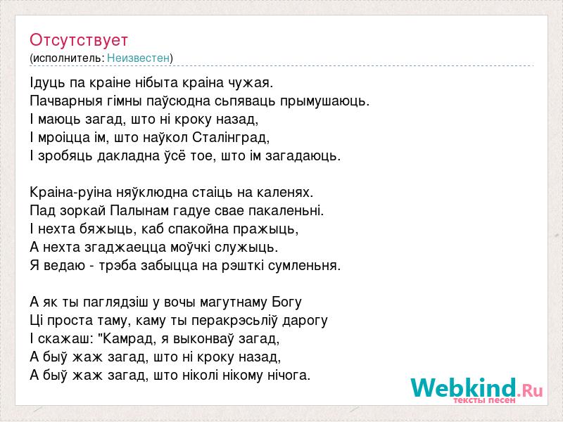 Ідуць па краіне нібыта краіна чужая. Пачварныя гімны паўсюдна сьпяваць прымушаюць. І маюць загад, што ні кроку назад, І мроіцца ім, што наўкол Сталінград, І зробяць дакладна ўсё тое, што ім загадаюць. Краіна-руіна няўклюдна стаіць на каленях. Пад зоркай Палынам гадуе свае пакаленьні. І нехта бяжыць, каб спакойна пражыць, А нехта згаджаецца моўчкі служыць. Я ведаю - трэба забыцца на рэшткі сумленьня. А як ты паглядзіш у вочы магутнаму Богу Ці проста таму, каму ты перакрэсьліў дарогу І скажаш: "Камрад, я выконваў загад, А быў жаж загад, што ні кроку назад, А быў жаж загад, што ніколі нікому нічога.