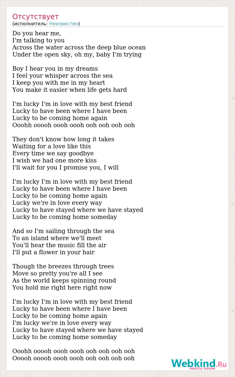 Do you hear me, I'm talking to you Across the water across the deep blue ocean Under the open sky, oh my, baby I'm trying Boy I hear you in my dreams I feel your whisper across the sea I keep you with me in my heart You make it easier when life gets hard I'm lucky I'm in love with my best friend Lucky to have been where I have been Lucky to [bad word] home again Ooohh ooooh oooh oooh ooh ooh ooh ooh They don't know how long it takes Waiting for a love like this Every time we say goodbye I wish we had one more kiss I'll wait for you I promise you, I will I'm lucky I'm in love with my best friend Lucky to have been where I have been Lucky to [bad word] home again Lucky we're in love every way Lucky to have stayed where we have stayed Lucky to [bad word] home someday And so I'm sailing through the sea To an island where we'll meet You'll hear the music fill the air I'll put a flower in your hair Though the breezes through trees Move so pretty you're all I see As the world keeps spinning round You hold me right here right now I'm lucky I'm in love with my best friend Lucky to have been where I have been Lucky to [bad word] home again I'm lucky we're in love every way Lucky to have stayed where we have stayed Lucky to [bad word] home someday Ooohh ooooh oooh oooh ooh ooh ooh ooh Ooooh ooooh oooh oooh ooh ooh ooh ooh