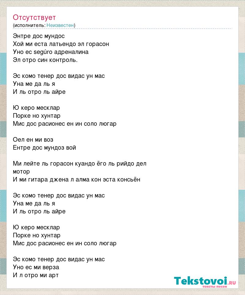 Энтре дос мундос Хой ми еста латьендо эл горасон Уно ес segúro адреналина Эл отро син контроль. Эс комо тенер дос видас ун мас Уна ме да ль я И ль отро ль айре Ю керо месклар Порке но хунтар Мис дос расионес ен ин соло люгар Оел ен ми воз Ентре дос мундоз вой Ми лейте ль горасон куандо ёго ль рийдо дел мотор И ми гитара джена л алма кон эста консьён Эс комо тенер дос видас ун мас Уна ме да ль я И ль отро ль айре Ю керо месклар Порке но хунтар Мис дос расионес ен ин соло люгар Эс комо тенер дос видас ун мас Уно ес ми верза И л отро ми арт
