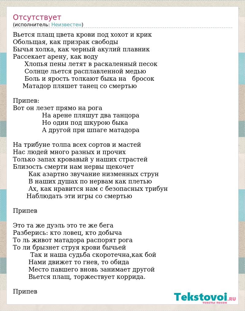 Вьется плащ цвета крови под хохот и крик Обольщая, как призрак свободы Бычья холка, как черный акулий плавник Рассекает арену, как воду Хлопья пены летят в раскаленный песок Солнце льется расплавленной медью Боль и ярость толкают быка на бросок Матадор пляшет танец со смертью Припев: Вот он лезет прямо на рога На арене пляшут два танцора Но один под шкурою быка А другой при шпаге матадора На трибуне толпа всех сортов и мастей Нас людей много разных и прочих Только запах кровавый у наших страстей Близость смерти нам нервы щекочет Как азартно звучание низменных струн В наших душах по нервам как плетью Ах, как нравится нам с безопасных трибун Наблюдать эти игры со смертью Припев Это та же дуэль это те же бега Разберись: кто ловец, кто добыча То ль живот матадора распорят рога То ли брызнет струя крови бычьей Так и наша судьба скоротечна,как бой Нами движет то гнев, то обида Место павшего вновь занимает другой Вьется плащ, торжествует коррида. Припев