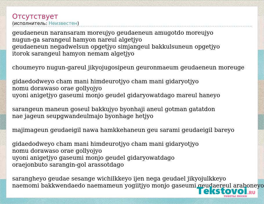 geudaeneun naransaram moreujyo geudaeneun amugotdo moreujyo nugun-ga sarangeul hamyon nareul algetjyo geudaeneun negadwelsun opgetjyo simjangeul bakkulsuneun opgetjyo itorok sarangeul hamyon nemam algetjyo choumeyro nugun-gareul jikyojugosipeun geuronmaeum geudaeneun moreuge gidaedodweyo cham mani himdeurotjyo cham mani gidaryotjyo nomu dorawaso orae gollyojyo uyoni anigetjyo gaseumi monjo geudel gidaryowatdago mareul haneyo sarangeun maneun goseul bakkujyo byonhaji aneul gotman gatatdon nae jageun seupgwandeulmajo byonhage hetjyo majimageun geudaeigil nawa hamkkehaneun geu sarami geudaeigil bareyo gidaedodweyo cham mani himdeurotjyo cham mani gidaryotjyo nomu dorawaso orae gollyojyo uyoni anigetjyo gaseumi monjo geudel gidaryowatdago oraejonbuto sarangin-gol arassotdago sarangheyo geudae sesange wichilkkeyo ijen nega geudael jikyojulkkeyo naemomi bakkwendaedo naemameun yogiitjyo monjo gaseumi geudaereul araboneyo