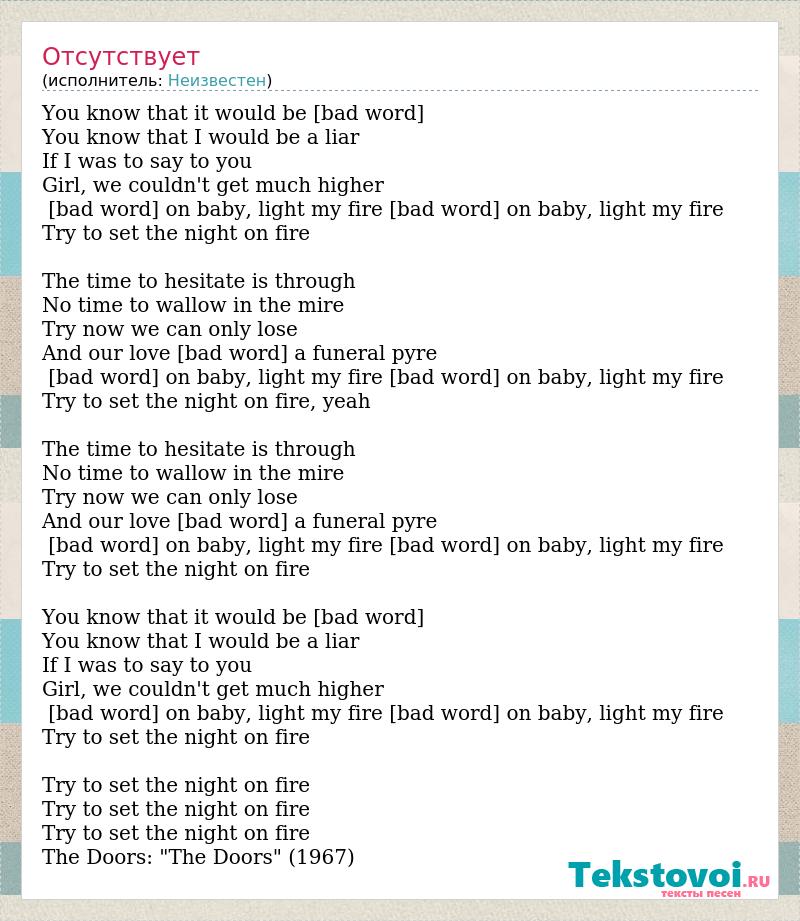 You know that it would be [bad word] You know that I would be a liar If I was to say to you Girl, we couldn't get much higher [bad word] on baby, light my fire [bad word] on baby, light my fire Try to set the night on fire The time to hesitate is through No time to wallow in the mire Try now we can only lose And our love [bad word] a funeral pyre [bad word] on baby, light my fire [bad word] on baby, light my fire Try to set the night on fire, yeah The time to hesitate is through No time to wallow in the mire Try now we can only lose And our love [bad word] a funeral pyre [bad word] on baby, light my fire [bad word] on baby, light my fire Try to set the night on fire You know that it would be [bad word] You know that I would be a liar If I was to say to you Girl, we couldn't get much higher [bad word] on baby, light my fire [bad word] on baby, light my fire Try to set the night on fire Try to set the night on fire Try to set the night on fire Try to set the night on fire The Doors: "The Doors" (1967)