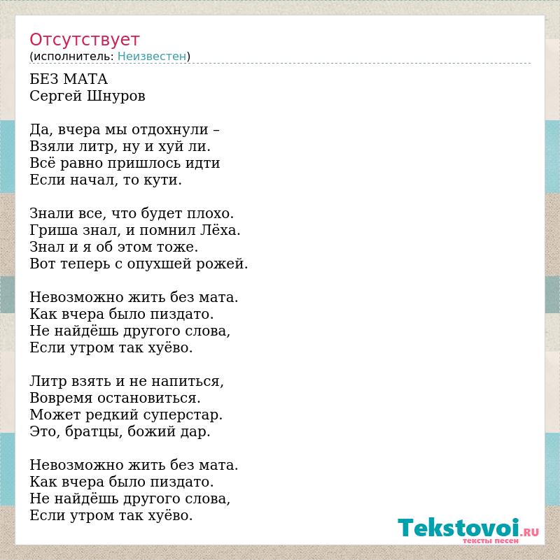 БЕЗ МАТА Сергей Шнуров Да, вчера мы отдохнули – Взяли литр, ну и хуй ли. Всё равно пришлось идти Если начал, то кути. Знали все, что будет плохо. Гриша знал, и помнил Лёха. Знал и я об этом тоже. Вот теперь с опухшей рожей. Невозможно жить без мата. Как вчера было пиздато. Не найдёшь другого слова, Если утром так хуёво. Литр взять и не напиться, Вовремя остановиться. Может редкий суперстар. Это, братцы, божий дар. Невозможно жить без мата. Как вчера было пиздато. Не найдёшь другого слова, Если утром так хуёво.