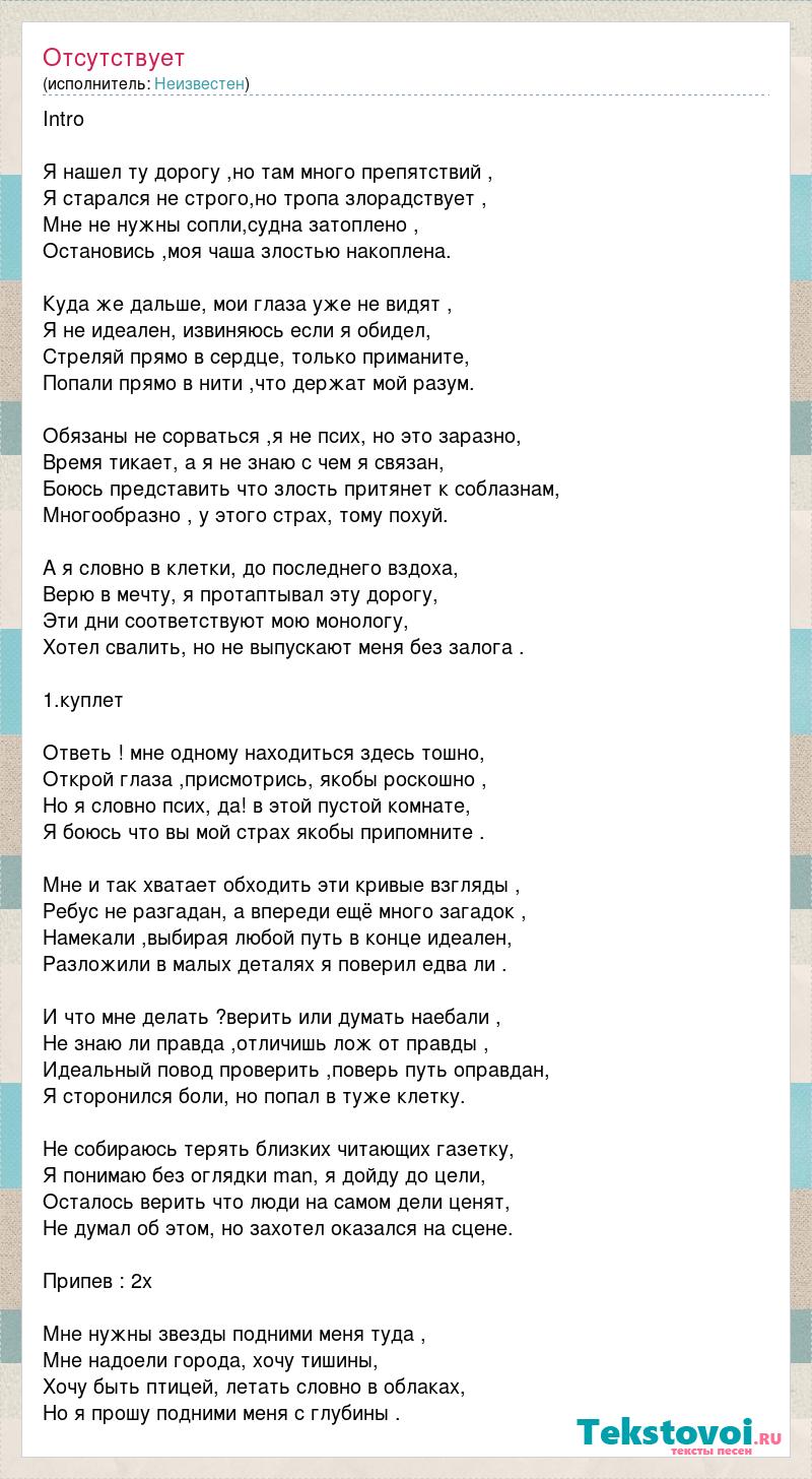 Intro Я нашел ту дорогу ,но там много препятствий , Я старался не строго,но тропа злорадствует , Мне не нужны сопли,судна затоплено , Остановись ,моя чаша злостью накоплена. Куда же дальше, мои глаза уже не видят , Я не идеален, извиняюсь если я обидел, Стреляй прямо в сердце, только приманите, Попали прямо в нити ,что держат мой разум. Обязаны не сорваться ,я не псих, но это заразно, Время тикает, а я не знаю с чем я связан, Боюсь представить что злость притянет к соблазнам, Многообразно , у этого страх, тому похуй. А я словно в клетки, до последнего вздоха, Верю в мечту, я протаптывал эту дорогу, Эти дни соответствуют мою монологу, Хотел свалить, но не выпускают меня без залога . 1.куплет Ответь ! мне одному находиться здесь тошно, Открой глаза ,присмотрись, якобы роскошно , Но я словно псих, да! в этой пустой комнате, Я боюсь что вы мой страх якобы припомните . Мне и так хватает обходить эти кривые взгляды , Ребус не разгадан, а впереди ещё много загадок , Намекали ,выбирая любой путь в конце идеален, Разложили в малых деталях я поверил едва ли . И что мне делать ?верить или думать наебали , Не знаю ли правда ,отличишь лож от правды , Идеальный повод проверить ,поверь путь оправдан, Я сторонился боли, но попал в туже клетку. Не собираюсь терять близких читающих газетку, Я понимаю без оглядки man, я дойду до цели, Осталось верить что люди на самом дели ценят, Не думал об этом, но захотел оказался на сцене. Припев : 2x Мне нужны звезды подними меня туда , Мне надоели города, хочу тишины, Хочу быть птицей, летать словно в облаках, Но я прошу подними меня с глубины .