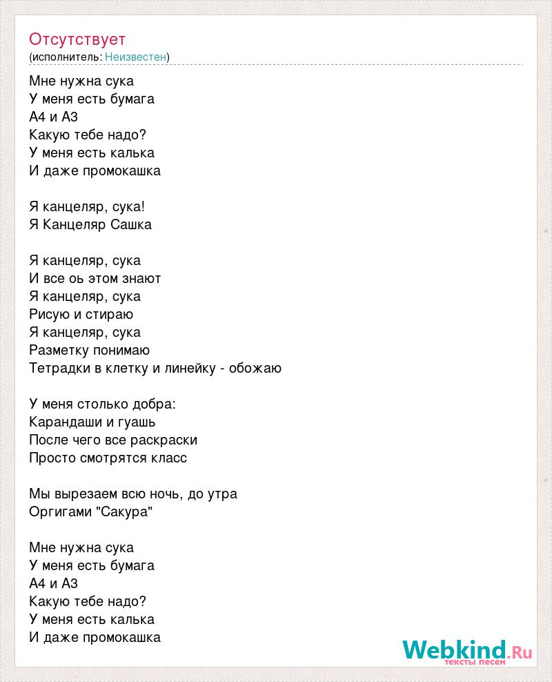 Мне нужна сука У меня есть бумага А4 и А3 Какую тебе надо? У меня есть калька И даже промокашка Я канцеляр, сука! Я Канцеляр Сашка Я канцеляр, сука И все оь этом знают Я канцеляр, сука Рисую и стираю Я канцеляр, сука Разметку понимаю Тетрадки в клетку и линейку - обожаю У меня столько добра: Карандаши и гуашь После чего все раскраски Просто смотрятся класс Мы вырезаем всю ночь, до утра Оргигами "Сакура" Мне нужна сука У меня есть бумага А4 и А3 Какую тебе надо? У меня есть калька И даже промокашка