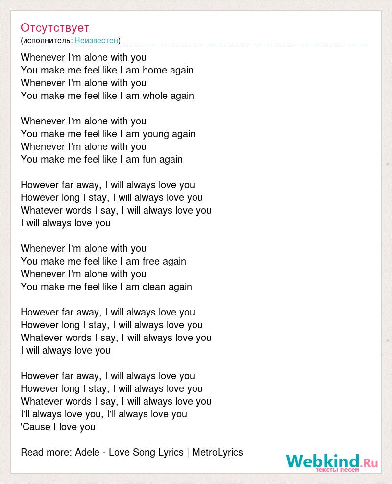 Whenever I'm alone with you You make me feel like I am home again Whenever I'm alone with you You make me feel like I am whole again Whenever I'm alone with you You make me feel like I am young again Whenever I'm alone with you You make me feel like I am fun again However far away, I will always love you However long I stay, I will always love you Whatever words I say, I will always love you I will always love you Whenever I'm alone with you You make me feel like I am free again Whenever I'm alone with you You make me feel like I am clean again However far away, I will always love you However long I stay, I will always love you Whatever words I say, I will always love you I will always love you However far away, I will always love you However long I stay, I will always love you Whatever words I say, I will always love you I'll always love you, I'll always love you 'Cause I love you Read more: Adele - Love Song Lyrics | MetroLyrics