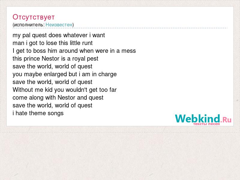 my pal quest does whatever i want man i got to lose this [bad word] I get to boss him around when were in a mess this prince Nestor is a royal pest save the world, world of quest you maybe enlarged but i am in charge save the world, world of quest Without me kid you wouldn't get too [bad word] along with Nestor and quest save the world, world of quest i hate theme songs