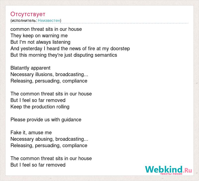 [bad word] threat sits in our house They keep on warning me But I'm not always listening And yesterday I heard the news of fire at my doorstep But this morning they're just disputing semantics Blatantly apparent Necessary illusions, broadcasting... Releasing, [bad word] [bad word] threat sits in our house But I feel so far removed Keep the production rolling Please provide us with guidance Fake it, amuse me Necessary abusing, broadcasting... Releasing, [bad word] [bad word] threat sits in our house But I feel so far removed