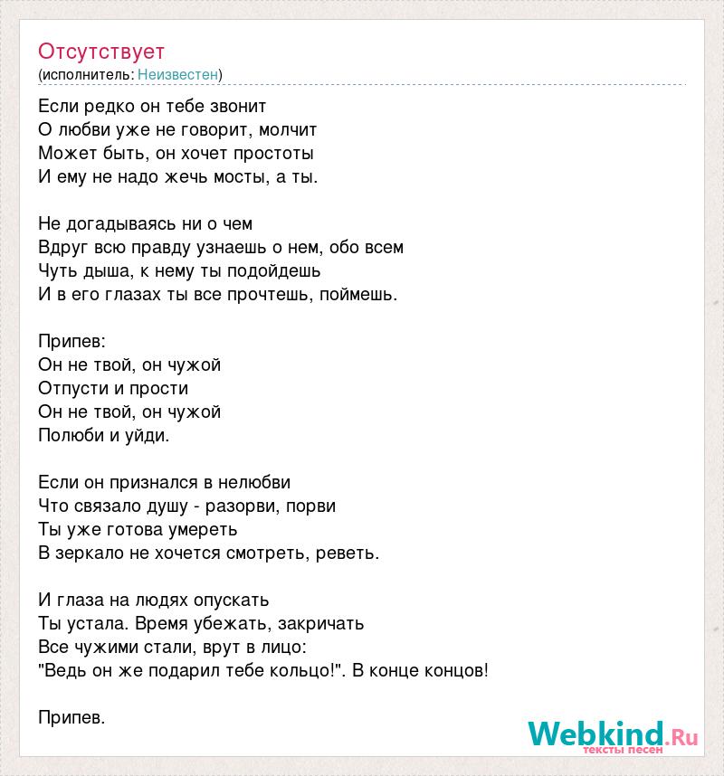 Если редко он тебе звонит О любви уже не говорит, молчит Может быть, он хочет простоты И ему не надо жечь мосты, а ты. Не догадываясь ни о чем Вдруг всю правду узнаешь о нем, обо всем Чуть дыша, к нему ты подойдешь И в его глазах ты все прочтешь, поймешь. Припев: Он не твой, он чужой Отпусти и прости Он не твой, он чужой Полюби и уйди. Если он признался в нелюбви Что связало душу - разорви, порви Ты уже готова умереть В зеркало не хочется смотреть, реветь. И глаза на людях опускать Ты устала. Время убежать, закричать Все чужими стали, врут в лицо: "Ведь он же подарил тебе кольцо!". В конце концов! Припев.