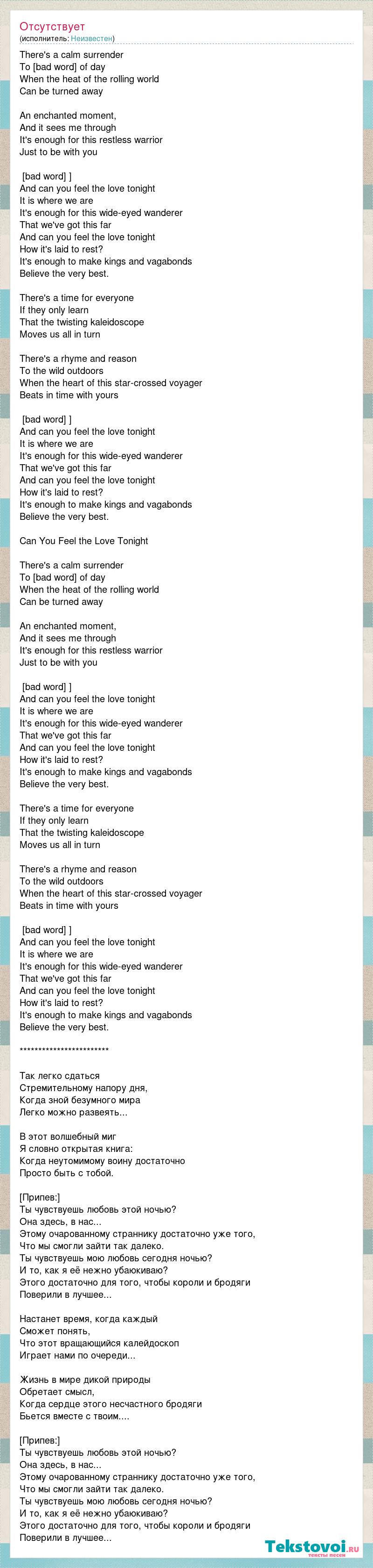 There's a calm surrender To [bad word] of day When the heat of the rolling world Can be turned away An enchanted moment, And it sees me through It's enough for this restless warrior Just to be with you [bad word] ] And can you feel the love tonight It is where we are It's enough for this wide-eyed wanderer That we've got this far And can you feel the love tonight How it's laid to rest? It's enough to make kings and vagabonds Believe the very best. There's a time for everyone If they only learn That the twisting kaleidoscope Moves us all in turn There's a rhyme and reason To the wild outdoors When the heart of this star-crossed voyager Beats in time with yours [bad word] ] And can you feel the love tonight It is where we are It's enough for this wide-eyed wanderer That we've got this far And can you feel the love tonight How it's laid to rest? It's enough to make kings and vagabonds Believe the very best. Can You Feel the Love Tonight There's a calm surrender To [bad word] of day When the heat of the rolling world Can be turned away An enchanted moment, And it sees me through It's enough for this restless warrior Just to be with you [bad word] ] And can you feel the love tonight It is where we are It's enough for this wide-eyed wanderer That we've got this far And can you feel the love tonight How it's laid to rest? It's enough to make kings and vagabonds Believe the very best. There's a time for everyone If they only learn That the twisting kaleidoscope Moves us all in turn There's a rhyme and reason To the wild outdoors When the heart of this star-crossed voyager Beats in time with yours [bad word] ] And can you feel the love tonight It is where we are It's enough for this wide-eyed wanderer That we've got this far And can you feel the love tonight How it's laid to rest? It's enough to make kings and vagabonds Believe the very best. ************************ Так легко сдаться Стремительному напору дня, Когда зной безумного мира Легко можно развеять... В этот волшебный миг Я словно открытая книга: Когда неутомимому воину достаточно Просто быть с тобой. [Припев:] Ты чувствуешь любовь этой ночью? Она здесь, в нас... Этому очарованному страннику достаточно уже того, Что мы смогли зайти так далеко. Ты чувствуешь мою любовь сегодня ночью? И то, как я её нежно убаюкиваю? Этого достаточно для того, чтобы короли и бродяги Поверили в лучшее... Настанет время, когда каждый Сможет понять, Что этот вращающийся калейдоскоп Играет нами по очереди... Жизнь в мире дикой природы Обретает смысл, Когда сердце этого несчастного бродяги Бьется вместе с твоим.... [Припев:] Ты чувствуешь любовь этой ночью? Она здесь, в нас... Этому очарованному страннику достаточно уже того, Что мы смогли зайти так далеко. Ты чувствуешь мою любовь сегодня ночью? И то, как я её нежно убаюкиваю? Этого достаточно для того, чтобы короли и бродяги Поверили в лучшее...