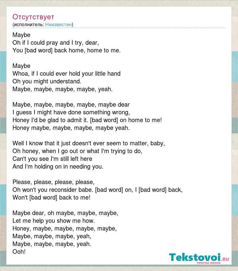 Maybe Oh if I could pray and I try, dear, You [bad word] back home, home to me. Maybe Whoa, if I could ever hold your little hand Oh you might understand. Maybe, maybe, maybe, maybe, yeah. Maybe, maybe, maybe, maybe, maybe dear I guess I might have done something wrong, Honey I'd be glad to admit it. [bad word] on home to me! Honey maybe, maybe, maybe, maybe yeah. Well I know that it just doesn't ever seem to matter, baby, Oh honey, when I go out or what I'm trying to do, Can't you see I'm still left here And I'm holding on in needing you. Please, please, please, please, Oh won't you reconsider babe. [bad word] on, I [bad word] back, Won't [bad word] back to me! Maybe dear, oh maybe, maybe, maybe, Let me help you show me how. Honey, maybe, maybe, maybe, maybe, Maybe, maybe, maybe, yeah, Maybe, maybe, maybe, yeah. Ooh!