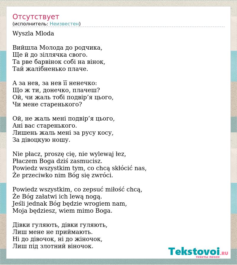 Wyszla Mloda Вийшла Молода до родчика, Ще й до зіллячка свого. Та рве барвінок собі на вінок, Тай жалібненько плаче. А за нев, за нев її ненечко: Що ж ти, донечко, плачеш? Ой, чи жаль тобі подвір’я цього, Чи мене старенького? Ой, не жаль мені подвір’я цього, Ані вас старенького. Лишень жаль мені за русу косу, За дівоцкую ношу. Nie płacz, proszę cię, nie wylewaj łez, Płaczem Boga dziś zasmucisz. Powiedz wszystkim tym, co chcą skłócić nas, Że przeciwko nim Bóg się zwróci. Powiedz wszystkim, co zepsuć miłość chcą, Że Bóg załatwi ich lewą nogą. Jeśli jednak Bóg będzie wrogiem nam, Moja będziesz, wiem mimo Boga. Дівки гуляють, дівки гуляють, Лиш мене не приймають. Ні до дівочок, ні до жіночок, Лиш під злотний віночок.