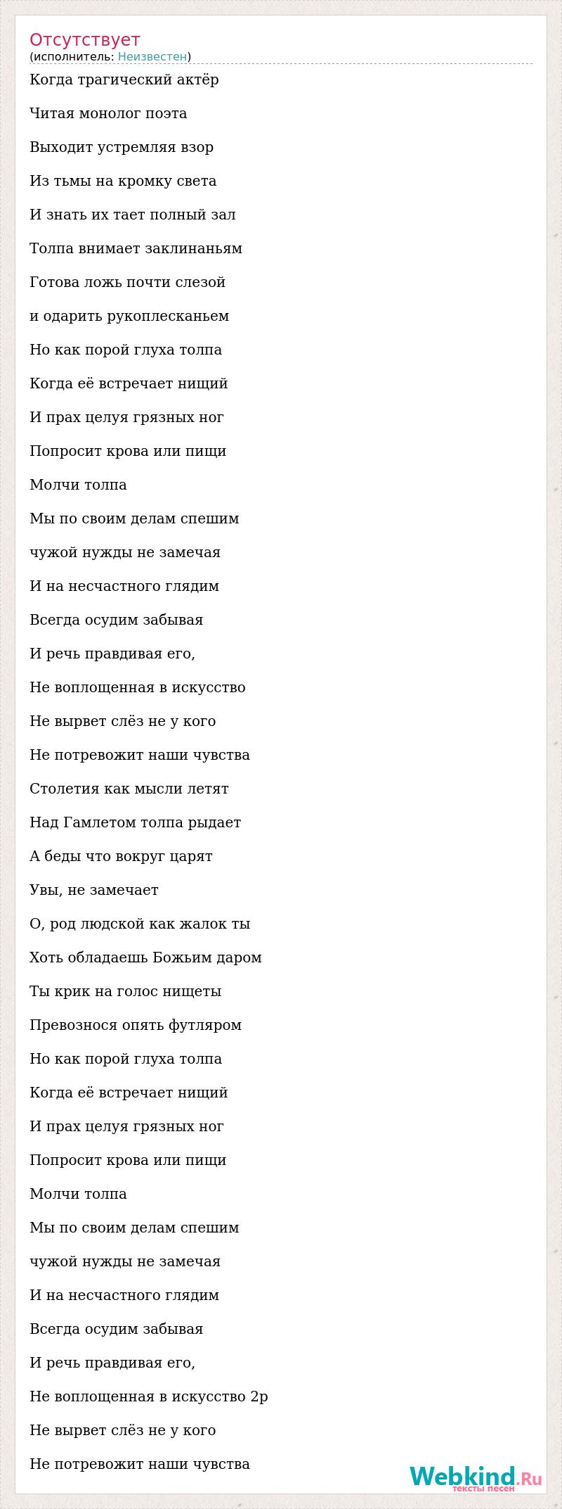 Когда трагический актёр Читая монолог поэта Выходит устремляя взор Из тьмы на кромку света И знать их тает полный зал Толпа внимает заклинаньям Готова ложь почти слезой и одарить рукоплесканьем Но как порой глуха толпа Когда её встречает нищий И прах целуя грязных ног Попросит крова или пищи Молчи толпа Мы по своим делам спешим чужой нужды не замечая И на несчастного глядим Всегда осудим забывая И речь правдивая его, Не воплощенная в искусство Не вырвет слёз не у кого Не потревожит наши чувства Столетия как мысли летят Над Гамлетом толпа рыдает А беды что вокруг царят Увы, не замечает О, род людской как жалок ты Хоть обладаешь Божьим даром Ты крик на голос нищеты Превознося опять футляром Но как порой глуха толпа Когда её встречает нищий И прах целуя грязных ног Попросит крова или пищи Молчи толпа Мы по своим делам спешим чужой нужды не замечая И на несчастного глядим Всегда осудим забывая И речь правдивая его, Не воплощенная в искусство 2р Не вырвет слёз не у кого Не потревожит наши чувства