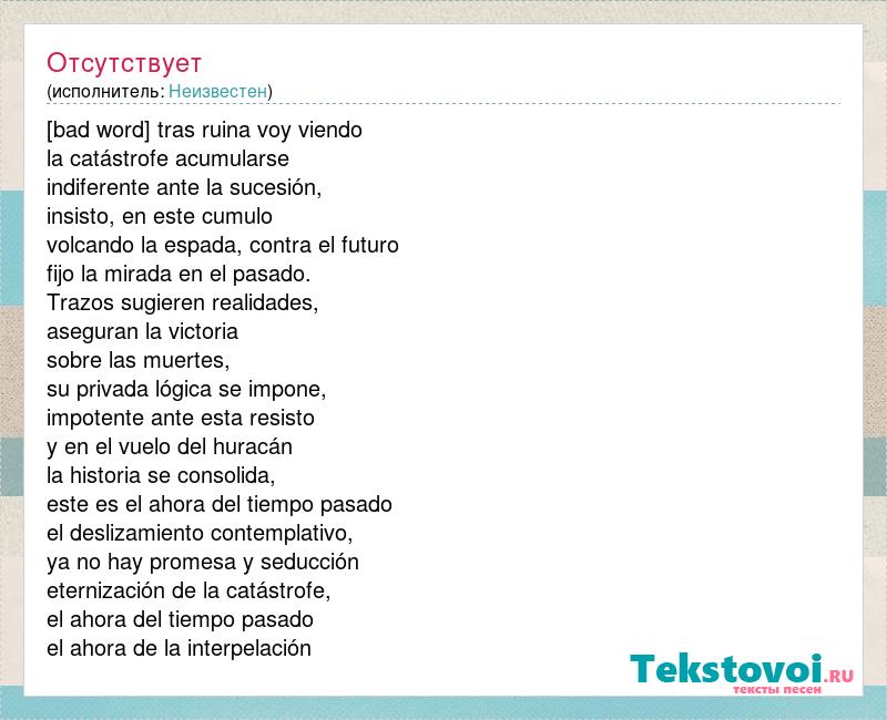 [bad word] tras ruina voy viendo la catástrofe acumularse indiferente ante la sucesión, insisto, en este cumulo volcando la espada, contra el futuro fijo la mirada en el pasado. Trazos sugieren realidades, aseguran la victoria sobre las muertes, su privada lógica se impone, impotente ante esta resisto y en el vuelo del huracán la historia se consolida, este es el ahora del tiempo pasado el deslizamiento contemplativo, ya no hay promesa y seducción eternización de la catástrofe, el ahora del tiempo pasado el ahora de la interpelación