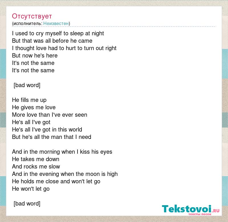 I used to cry myself to sleep at night But that was all before he came I thought love had to hurt to turn out right But now he's here It's not the same It's not the same [bad word] He fills me up He gives me love More love than I've ever seen He's all I've got He's all I've got in this world But he's all the man that I need And in the morning when I kiss his eyes He takes me down And rocks me slow And in the evening when the moon is high He holds me close and won't let go He won't let go [bad word]