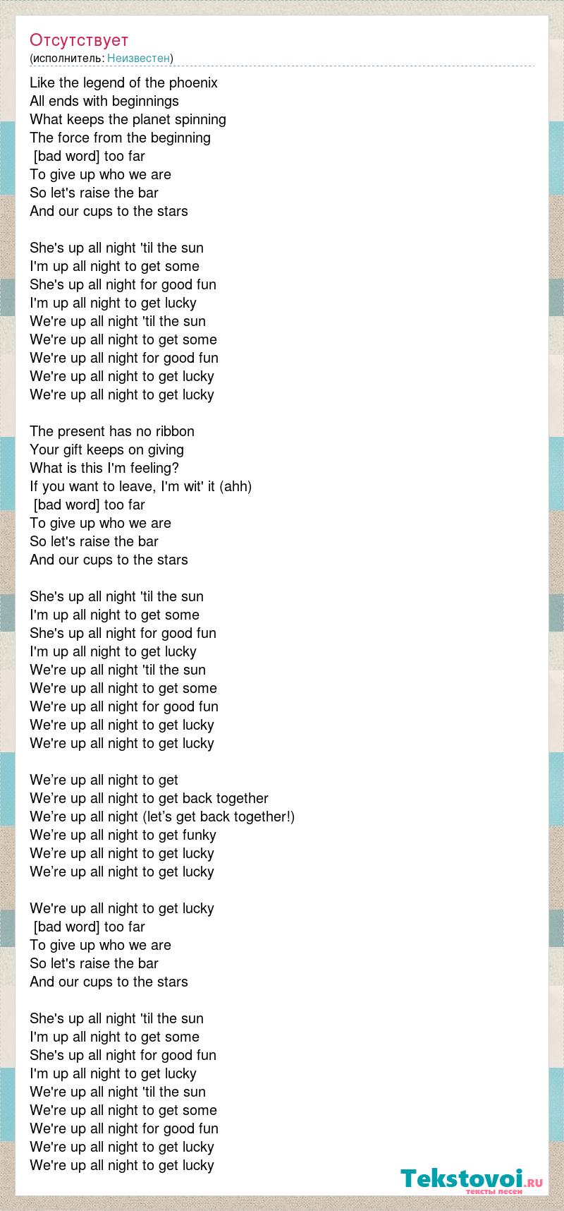 Like the legend of the phoenix All ends with beginnings What keeps the planet spinning The force from the beginning [bad word] too far To give up who we are So let's raise the bar And our cups to the stars She's up all night 'til the sun I'm up all night to get some She's up all night for good fun I'm up all night to get lucky We're up all night 'til the sun We're up all night to get some We're up all night for good fun We're up all night to get lucky We're up all night to get lucky The present has no ribbon Your gift keeps on giving What is this I'm feeling? If you want to leave, I'm wit' it (ahh) [bad word] too far To give up who we are So let's raise the bar And our cups to the stars She's up all night 'til the sun I'm up all night to get some She's up all night for good fun I'm up all night to get lucky We're up all night 'til the sun We're up all night to get some We're up all night for good fun We're up all night to get lucky We're up all night to get lucky We’re up all night to get We’re up all night to get back together We’re up all night (let’s get back together!) We’re up all night to get funky We’re up all night to get lucky We’re up all night to get lucky We're up all night to get lucky [bad word] too far To give up who we are So let's raise the bar And our cups to the stars She's up all night 'til the sun I'm up all night to get some She's up all night for good fun I'm up all night to get lucky We're up all night 'til the sun We're up all night to get some We're up all night for good fun We're up all night to get lucky We're up all night to get lucky