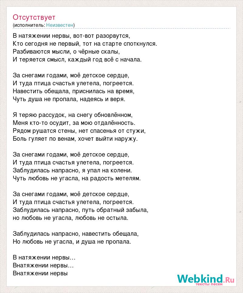 В натяжении нервы, вот-вот разорвутся, Кто сегодня не первый, тот на старте споткнулся. Разбиваются мысли, о чёрные скалы, И теряется смысл, каждый год всё с начала. За снегами годами, моё детское сердце, И туда птица счастья улетела, погреется. Навестить обещала, приснилась на время, Чуть душа не пропала, надеясь и веря. Я теряю рассудок, на снегу обновлённом, Меня кто-то осудит, за мою отдалённость. Рядом рушатся стены, нет спасенья от стужи, Боль гуляет по венам, хочет выйти наружу. За снегами годами, моё детское сердце, И туда птица счастья улетела, погреется. Заблудилась напрасно, я упал на колени. Чуть любовь не угасла, на радость метелям. За снегами годами, моё детское сердце, И туда птица счастья улетела, погреется. Заблудилась напрасно, путь обратный забыла, но любовь не угасла, любовь не остыла. Заблудилась напрасно, навестить обещала, Но любовь не угасла, и душа не пропала. В натяжении нервы… Внатяжении нервы… Внатяжении нервы